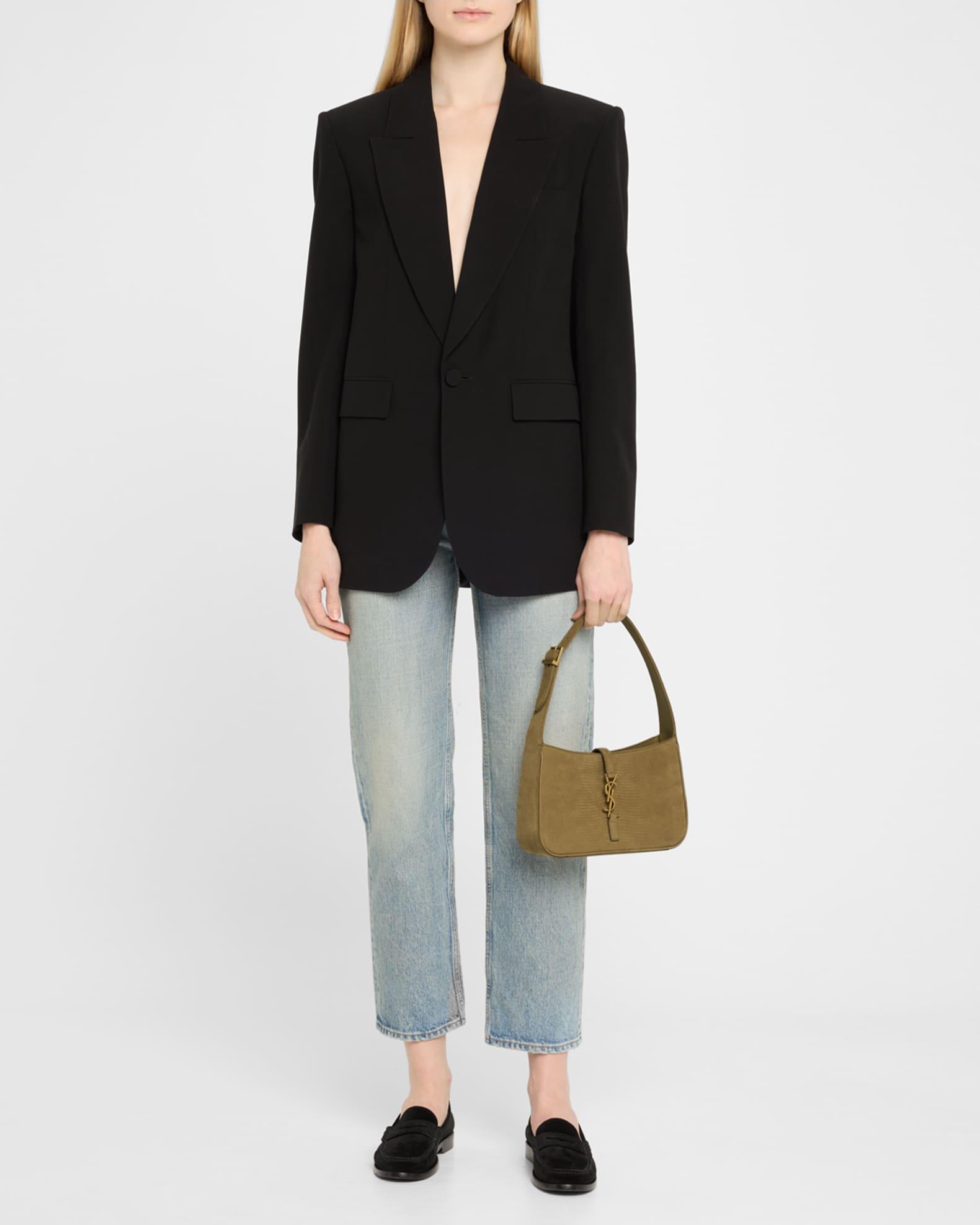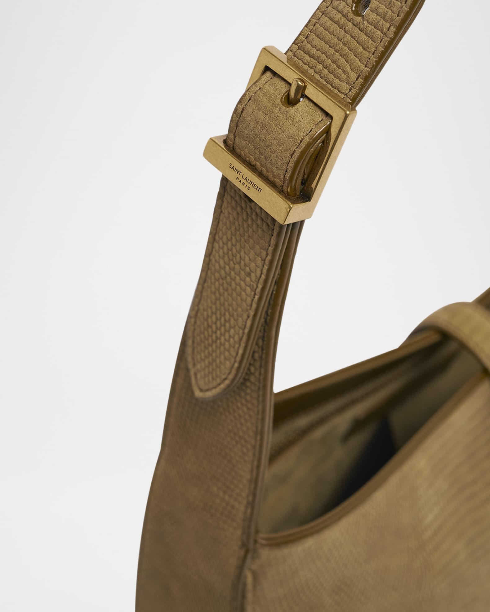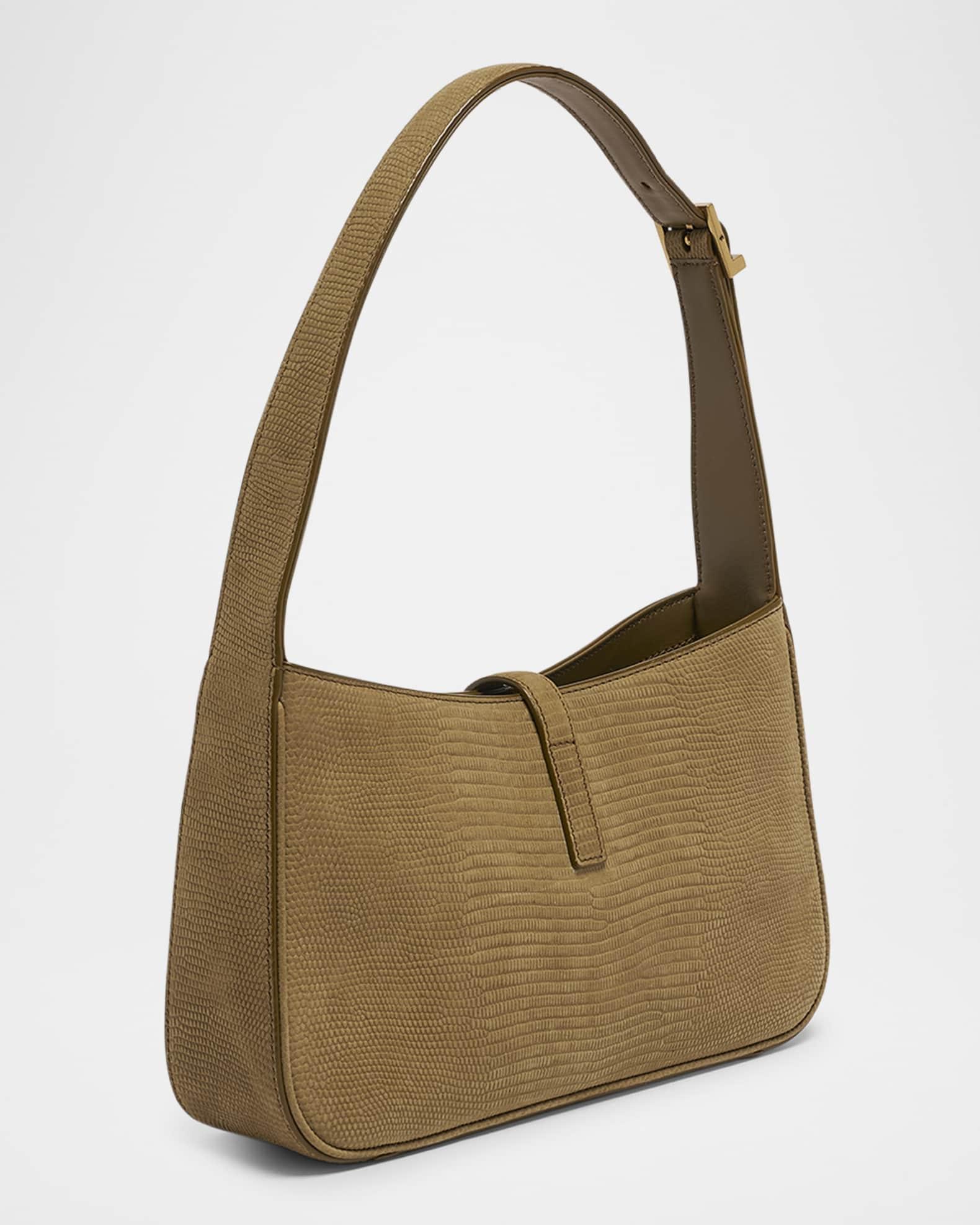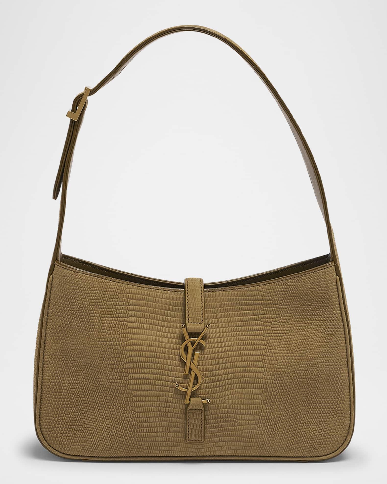 Saint Laurent's "Le 5 À 7" shoulder bag, crafted in lizard-effect nubuck leather, combines texture and luxury for a sophisticated statement. Adjustable shoulder strap Center flap top with YSL logo, tab closure Interior, zip pocket Light bronze hardware Approx. 6.2"H x 9"W x 2.6"D Made in Italy Proposition 65 warning for California residents
