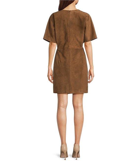 From Le' AL.X, this dress features: Genuine suede fabrication V-neckline Short sleeves Pullover construction Back zipper closure 2 functional side seam pockets A-line silhouette Modern fit Fully lined Straight hemline Mini length Approx. 35.25 HPS in length Self: Suede Lining: Polyester Professional leather/suede specialist dry cleaning only Imported. Dillard's Exclusive