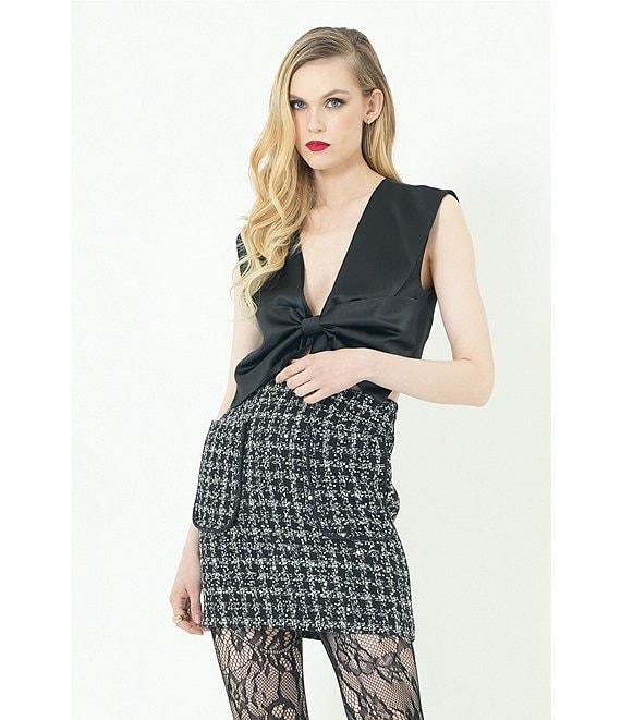 From Le' AL.X, this top features: Satin fabrication 3D bow detail V-neckline Sleeveless Pullover construction Zipper closure Mod top silhouette Fully lined Straight hemline Cropped length Approx. 17.75" HPS in length Self: polyester Lining: polyester/spandex Machine wash on cold cycle/wash with similar colors and fabrications/promptly remove from wash,/tumble dry on low cycle/use warm steam iron if needed. Imported. Dillard's Exclusive