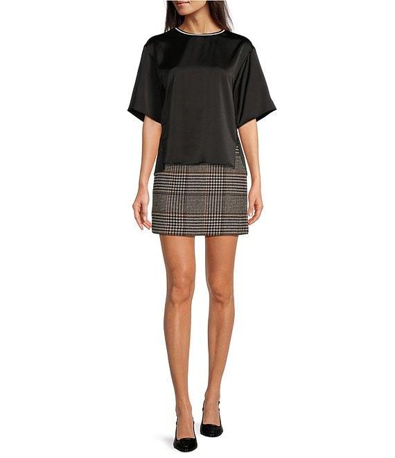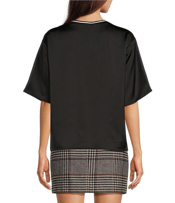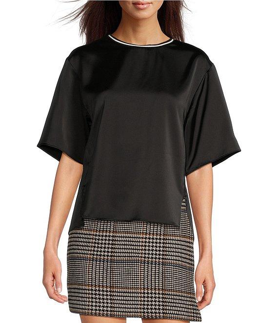 From Le' AL.X, this blouse features: Woven Satin Fabrication Contrast Trim Ribbed Crew Neckline Dropped Short Sleeves Pullover Construction Blouse Silhouette Side Split Opening at Hem Hi-Low Straight Hemline Average Length approx. 24.75" HPS in Length Lyocell Gently hand wash, lay flat to dry and reshape. Imported.