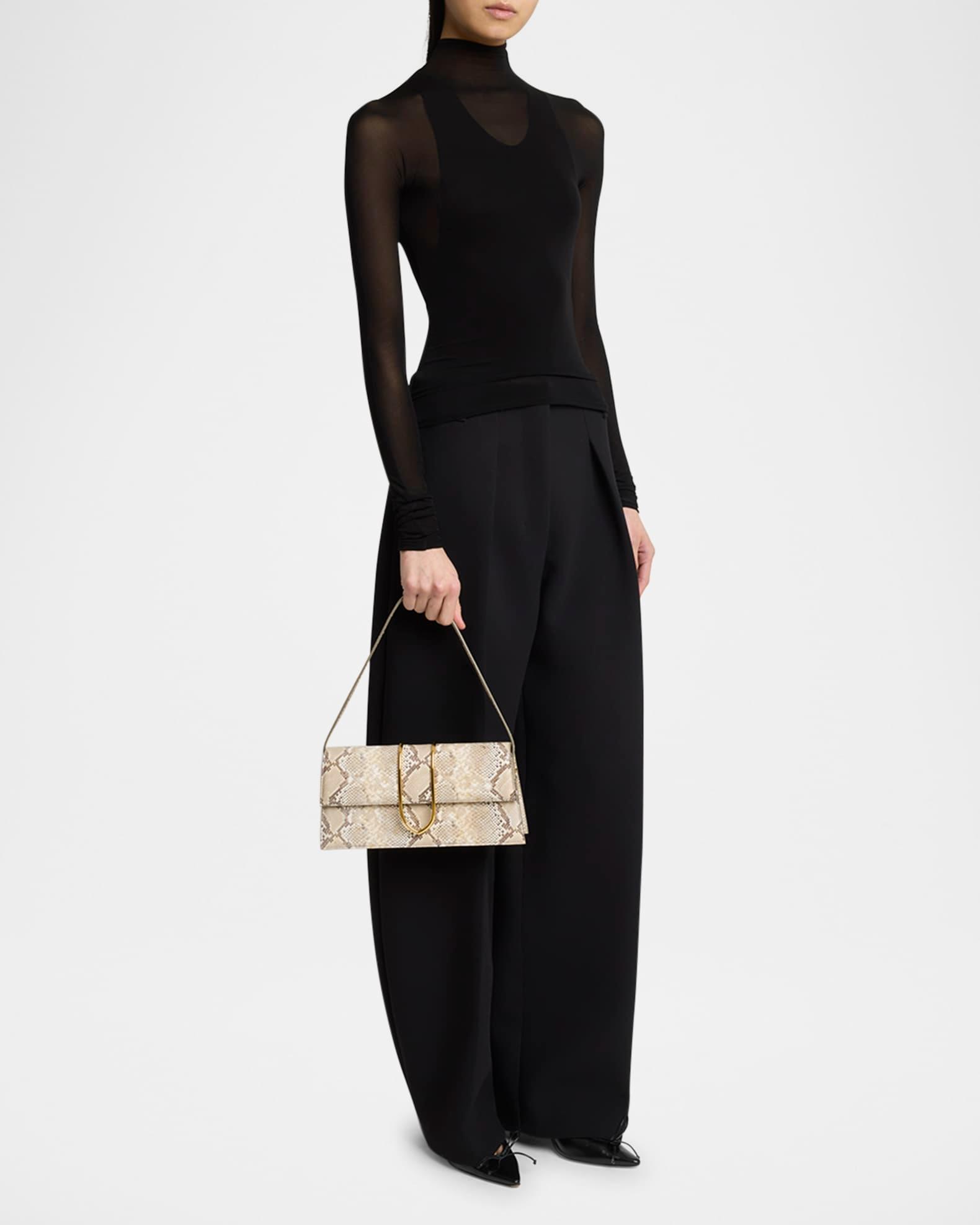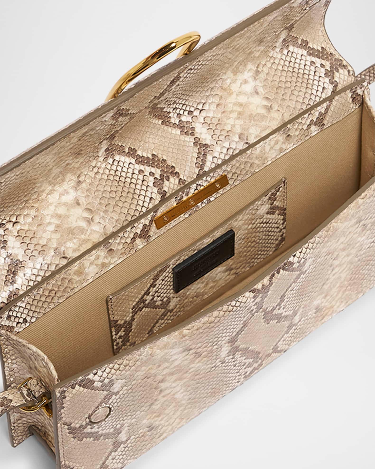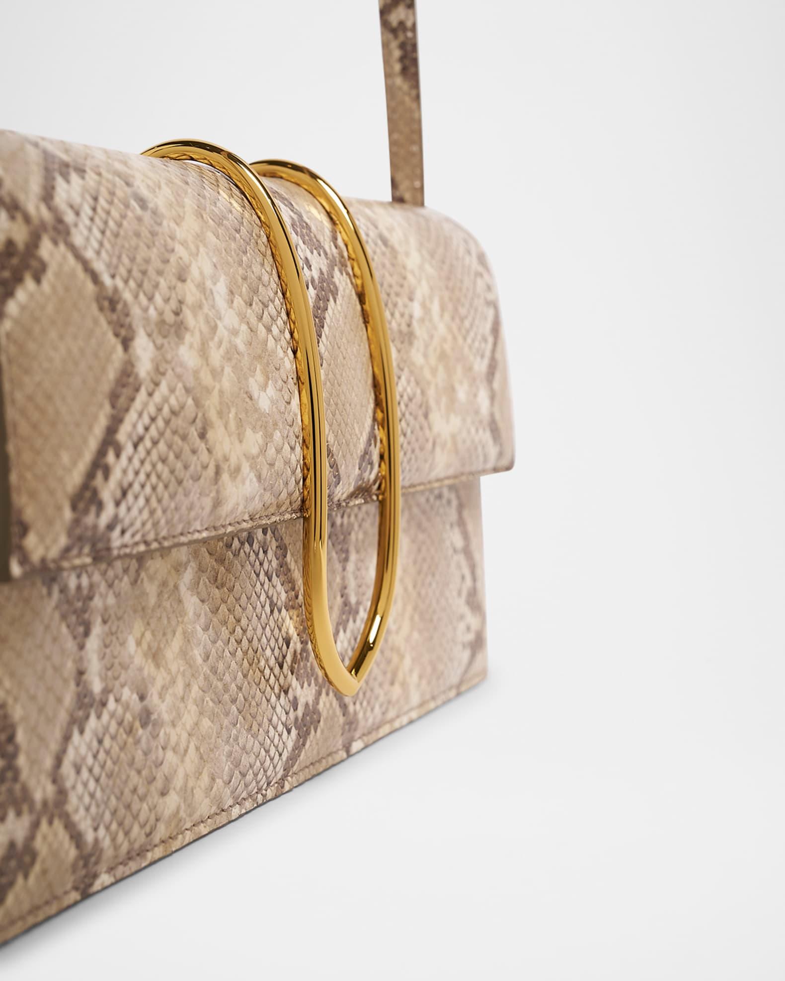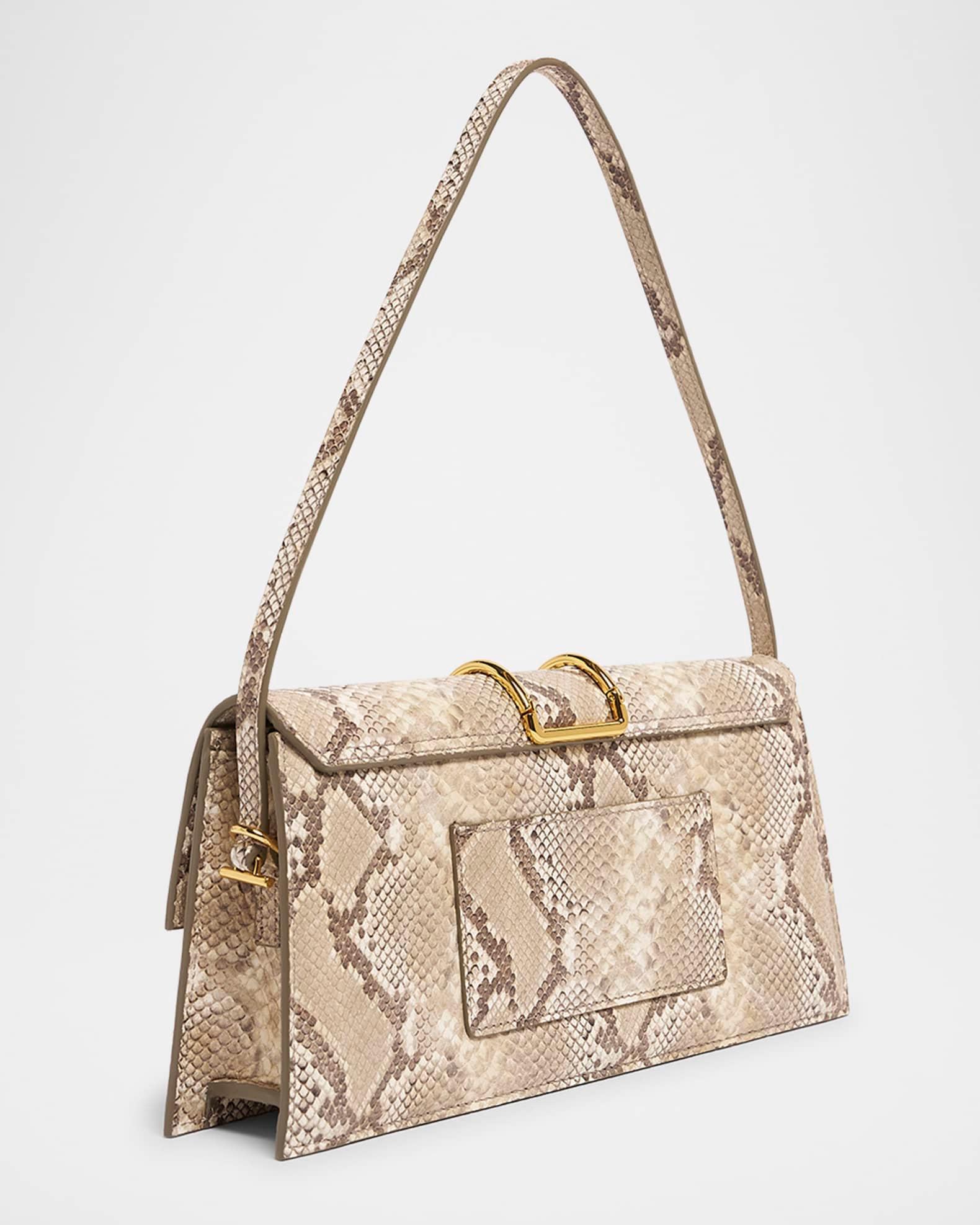 Jacquemus "Le Bambino Long" shoulder bag in snakeskin and calf leather Features gold-tone metal hardware Flat top handle Flap top with magnetic closure Interior, one slip pocket Exterior, back slip pocket Approx. 5.5"H x 11"W x 2.3"D Made in Italy