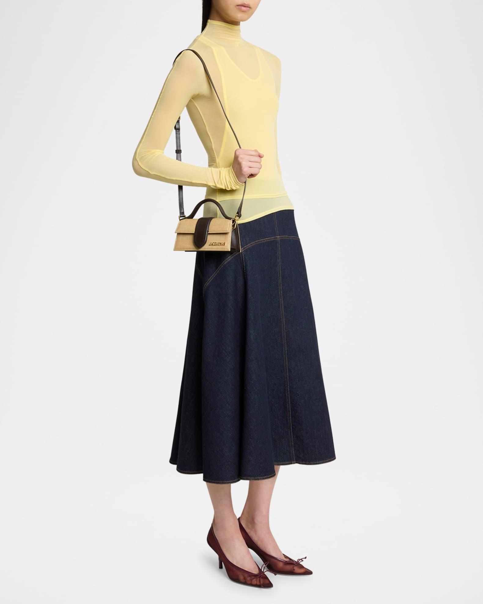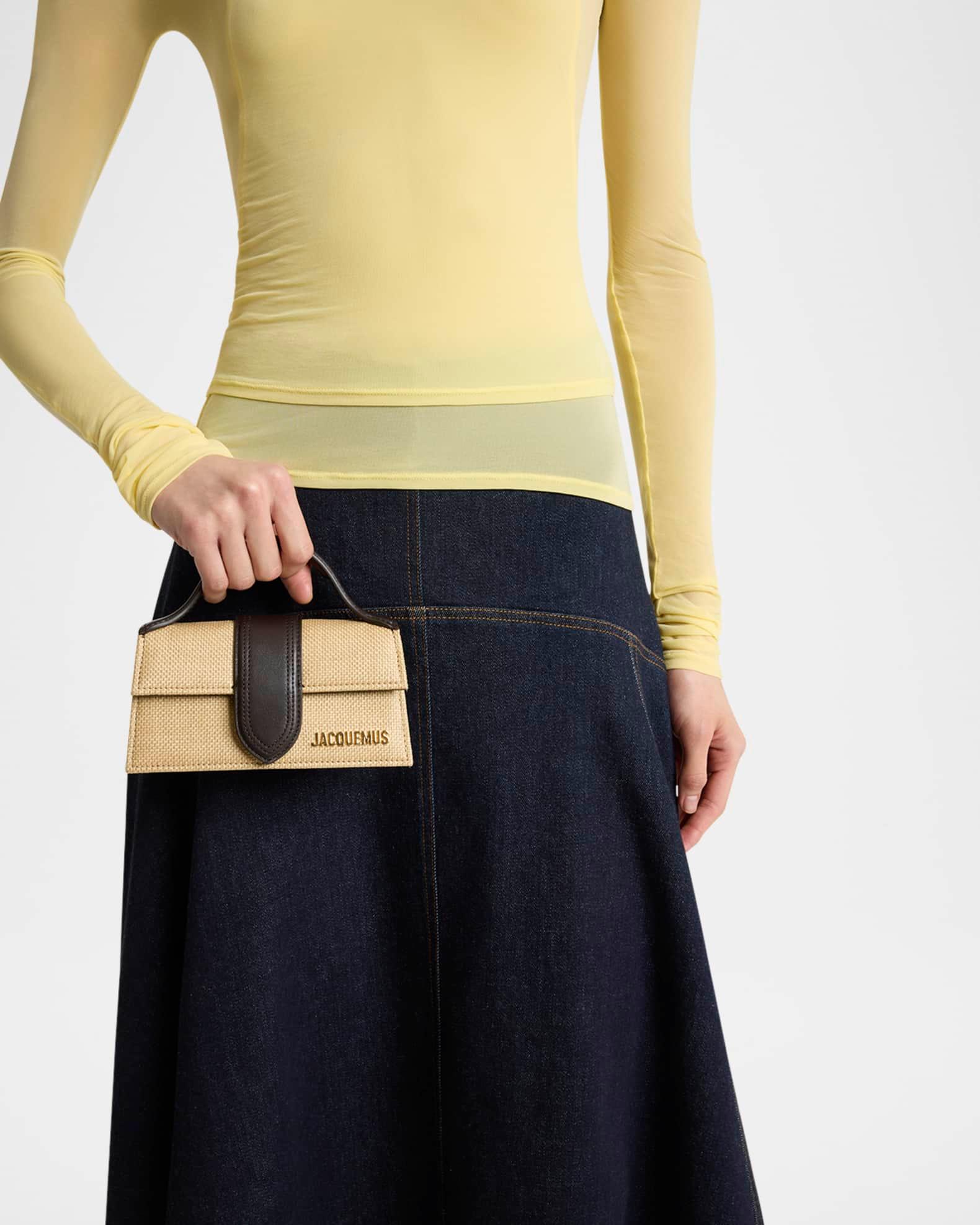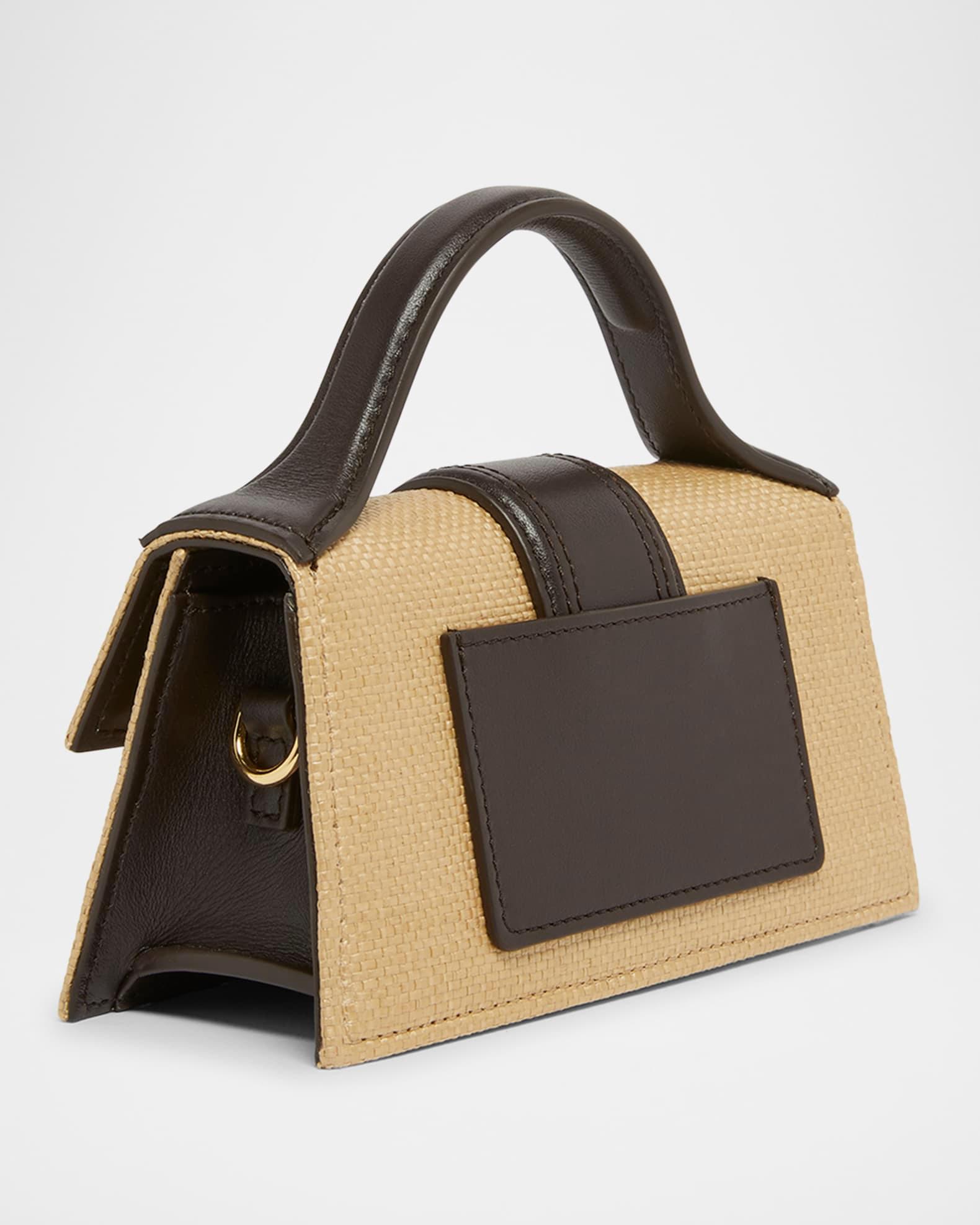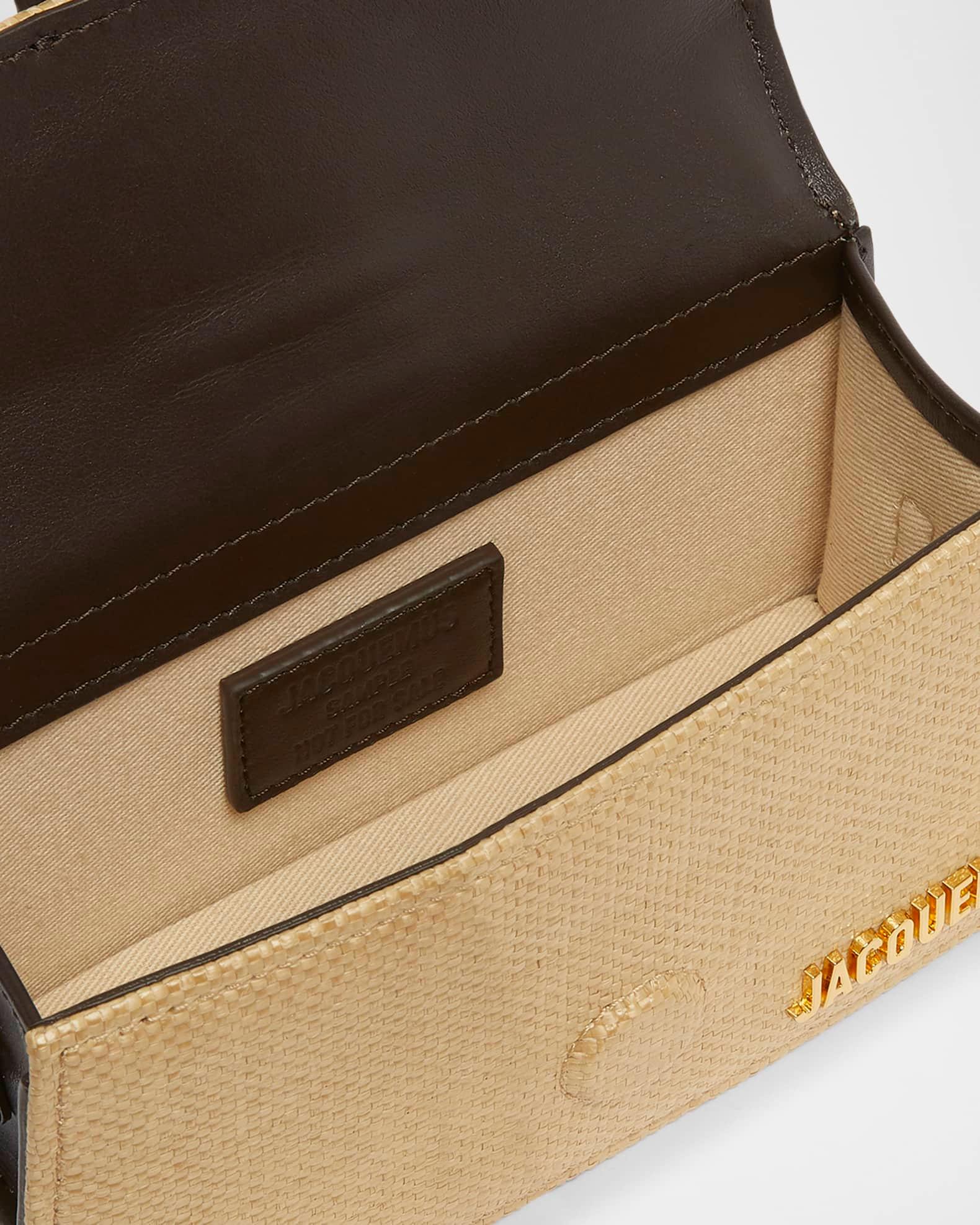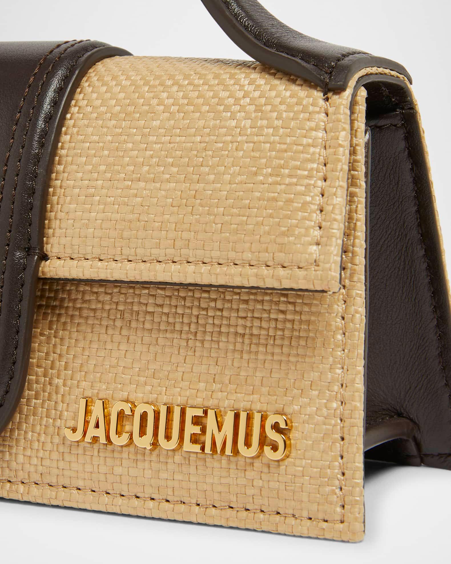 Jacquemus "Le Bambino" top handle bag in woven nylon, leather, and cotton Top handle Detachable shoulder strap Can be worn as a top handle or shoulder bag Flap top with magnetic closure Lining: Cotton Approx. 3.5"H x 6.9"W x 2.4"D Made in Italy
