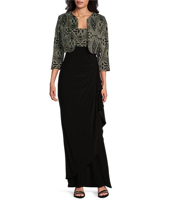 From Le Bos, this 2-piece jacket features: Jacket: ITY fabrication Cardigan silhouette Open neckline 3/4 sleeves Pullover closure Polyester/spandex Hand wash Dress: ITY fabrication Sheath silhouette Round neckline Sleeveless Cascade detailing Zipper back closure Approx. 57" in length Polyester/spandex Hand wash Imported.