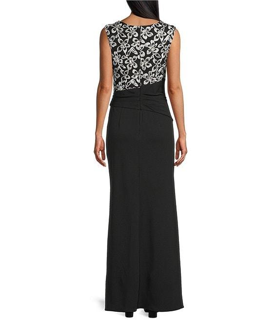 From Le Bos, this dress features: Scuba crepe fabrication Boat neckline Cap sleeves Floral top bodice Solid bottom Fit and flare silhouette Cascade side Center back zipper closure Approx. 60" in length from high point shoulder Polyester/spandex Machine wash/tumble dry low Imported.