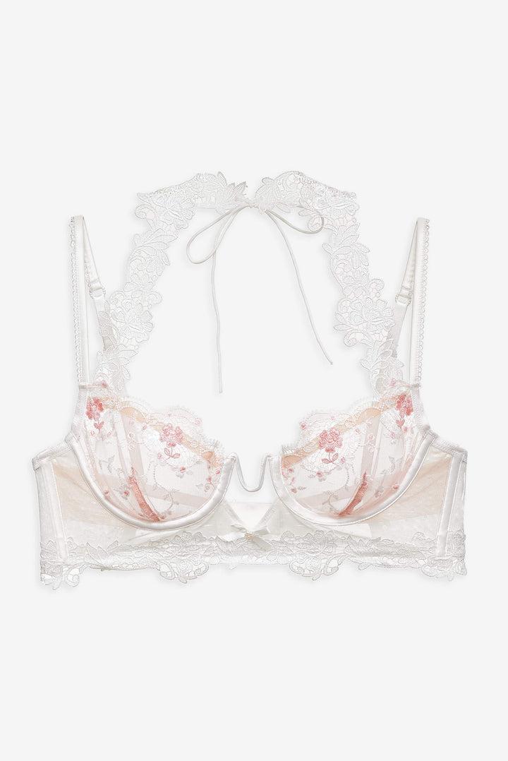 Le Fleur lace thong exudes nostalgic elegance with its floral embroidery and intricate lace trims. This high-waisted thong features a sheer white dotted mesh panel, keyhole cutout at back, and a decorative pearl flower that sits atop a satin bow.