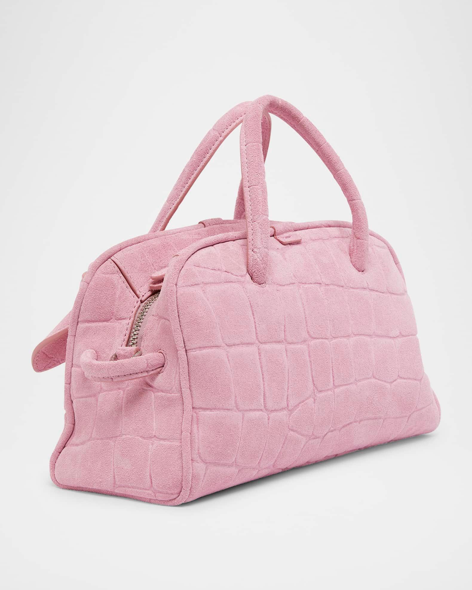 Jacquemus "Le Petit Turismo" bowling bag in soft, croc-embossed suede blended with calfskin leather trim Rolled top handles with knotted bow accent Detachable, adjustable crossbody strap Can be worn as a top handle or crossbody bag Two-way zip top closure Interior pocket Lining: Cotton Approx. 6.3"H x 9.8"W x 4.3"D Made in Italy