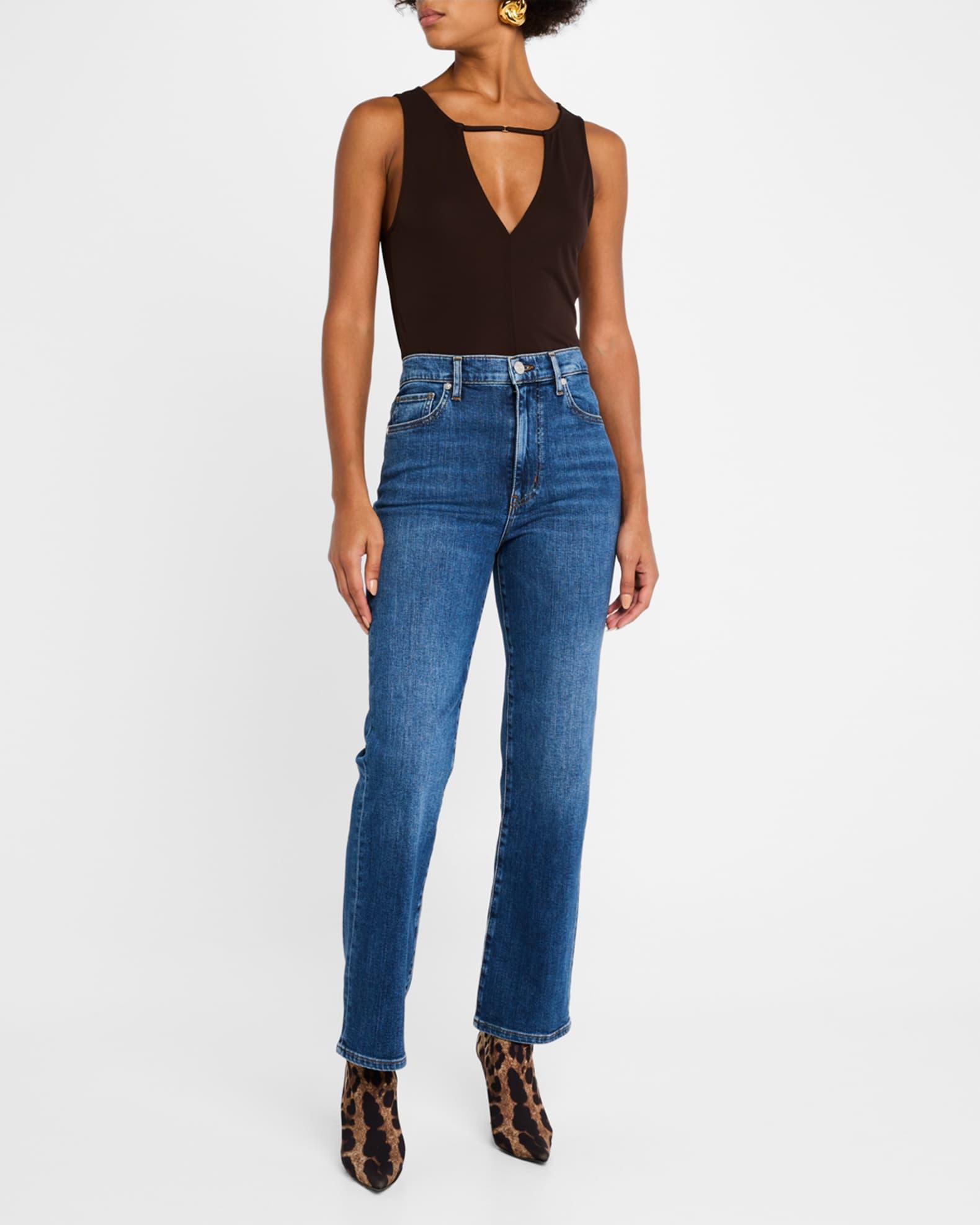 FRAME "Le Sleek Straight" jeans in dark-wash denim Approx. 11" rise; 28" inseam High rise Five-pocket style Easy fit Ankle length Button/zip fly; belt loops Cotton/modal/elasterell-p Machine wash cold, inside out Imported Model is 5'10"/177cm. Size Note: Item runs large, consider ordering a size down.