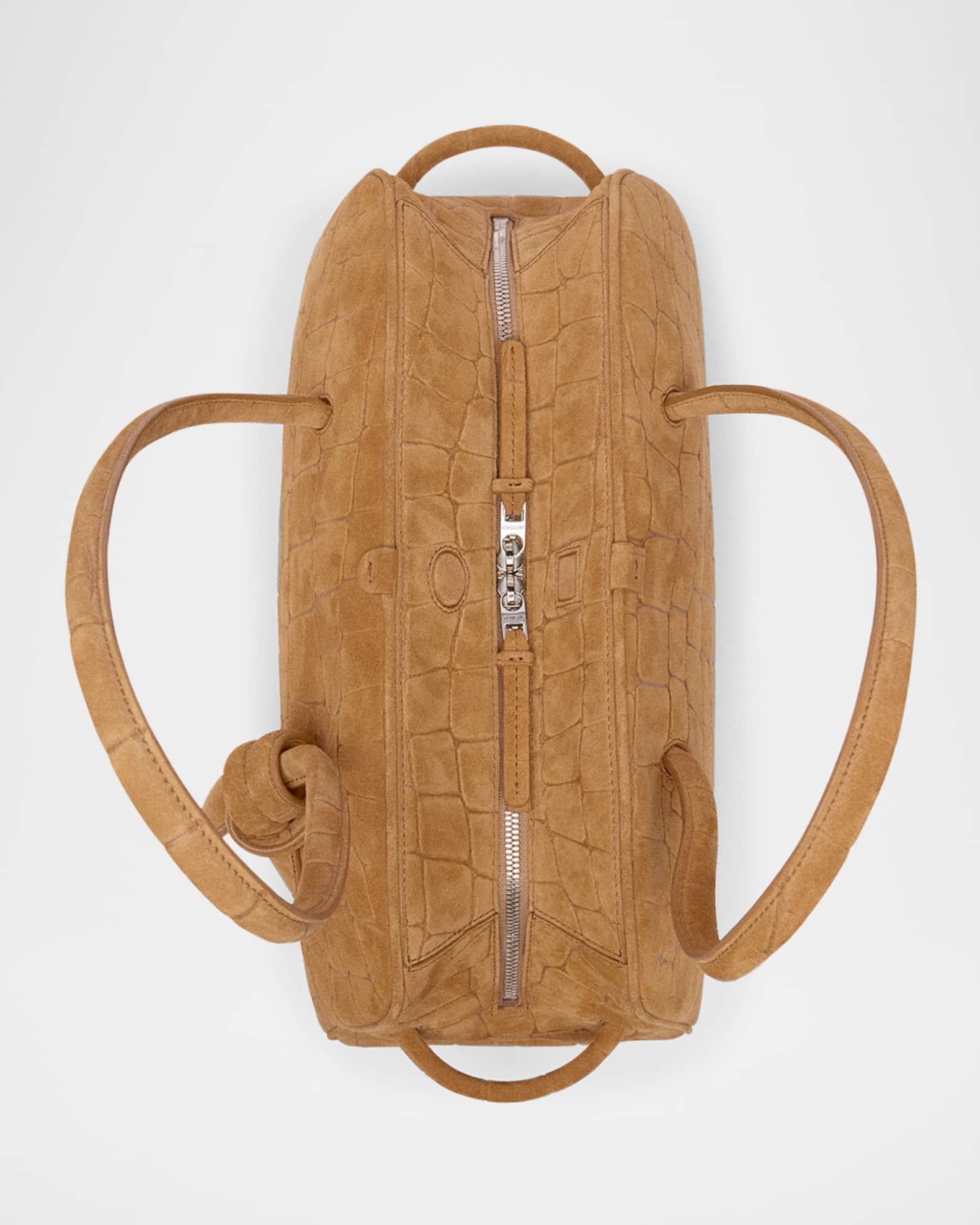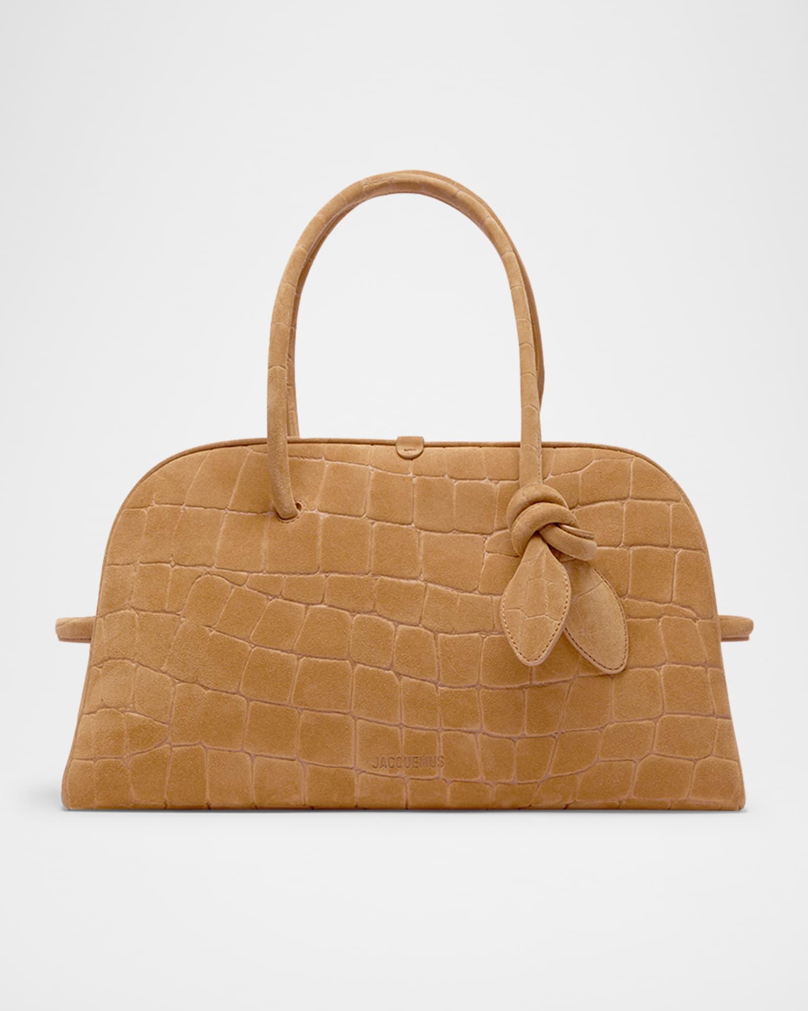 Crafted in luxurious croc-embossed suede, this "Le Turismo" Jacquemus top-handle bag sports the iconic bowling silhouette with a knotted bow for a touch of texture and analogous visual intrigue Rolled top handles Two-way zip top and magnetic closure Interior, one zip pocket, one slip pocket Approx. 8.3"H x 15.4"W x 6.7"D Made in Italy
