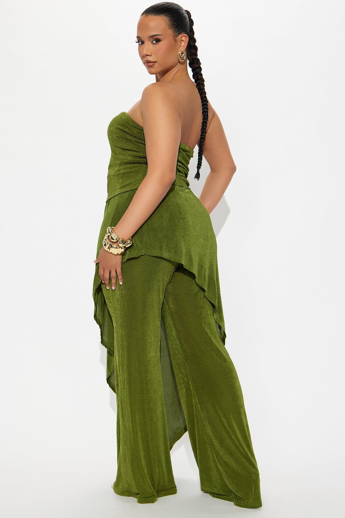 Available In Olive, Wine, And Orange. Long Tube Top And Flare Pant Set Stretch Tube Top Asymmetrical Regular 34" Inseam Elastic Waistband Self Top: 95% Polyester 5% Spandex Top Lining: 100% Polyester Pant Self: 95% Polyester 5% Spandex Imported