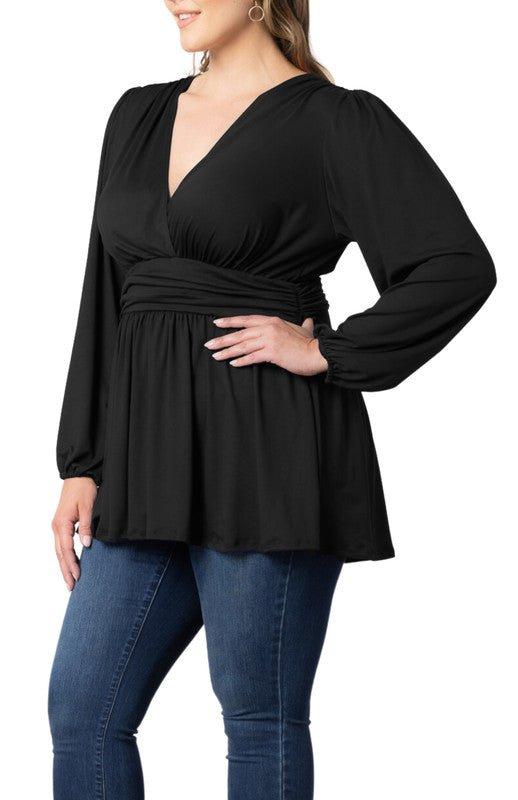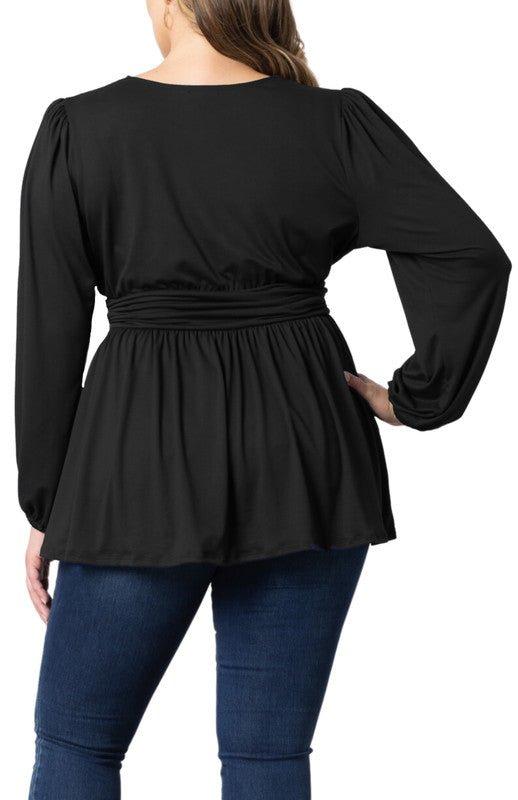 Find your new wardrobe essential in our Leah Long Sleeve Tunic Top. This effortless plus size top is designed with a flattering surplice neckline, long sleeves with elastic cuffs, and a cinched waist and flowy peplum shape. Available in women's plus sizes (0x,1x,2x,3x,4x,5x).