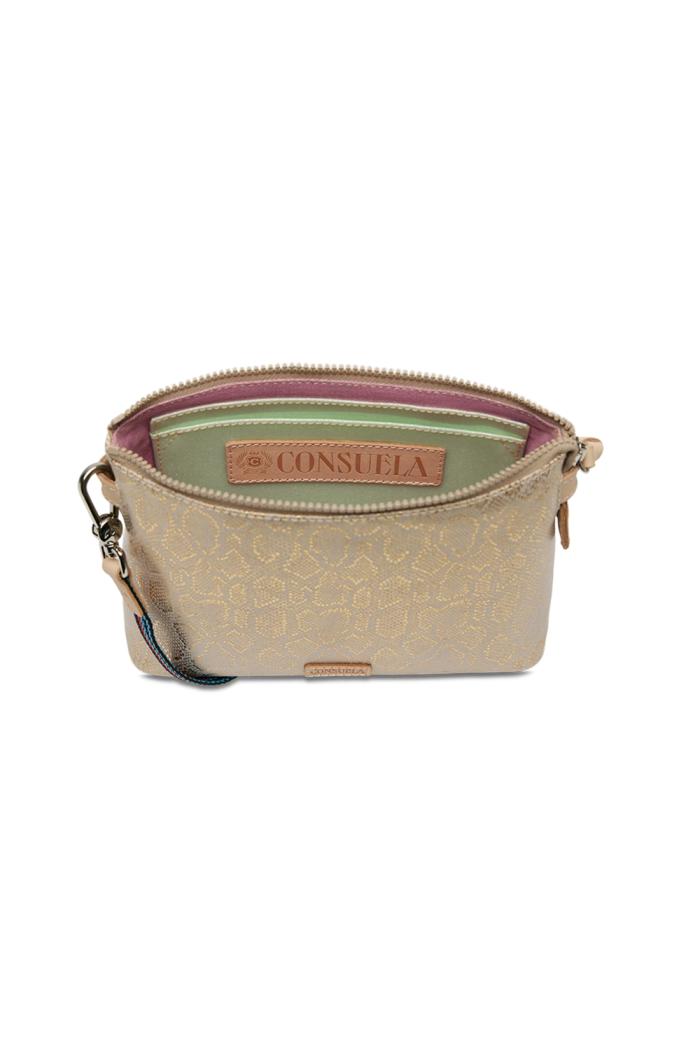 Keep your phone, keys, and wallet in this take-anywhere crossbody! An open pocket and a credit card slot pocket make this neutral, metallic crossbody bag a go-to for heading out the door.