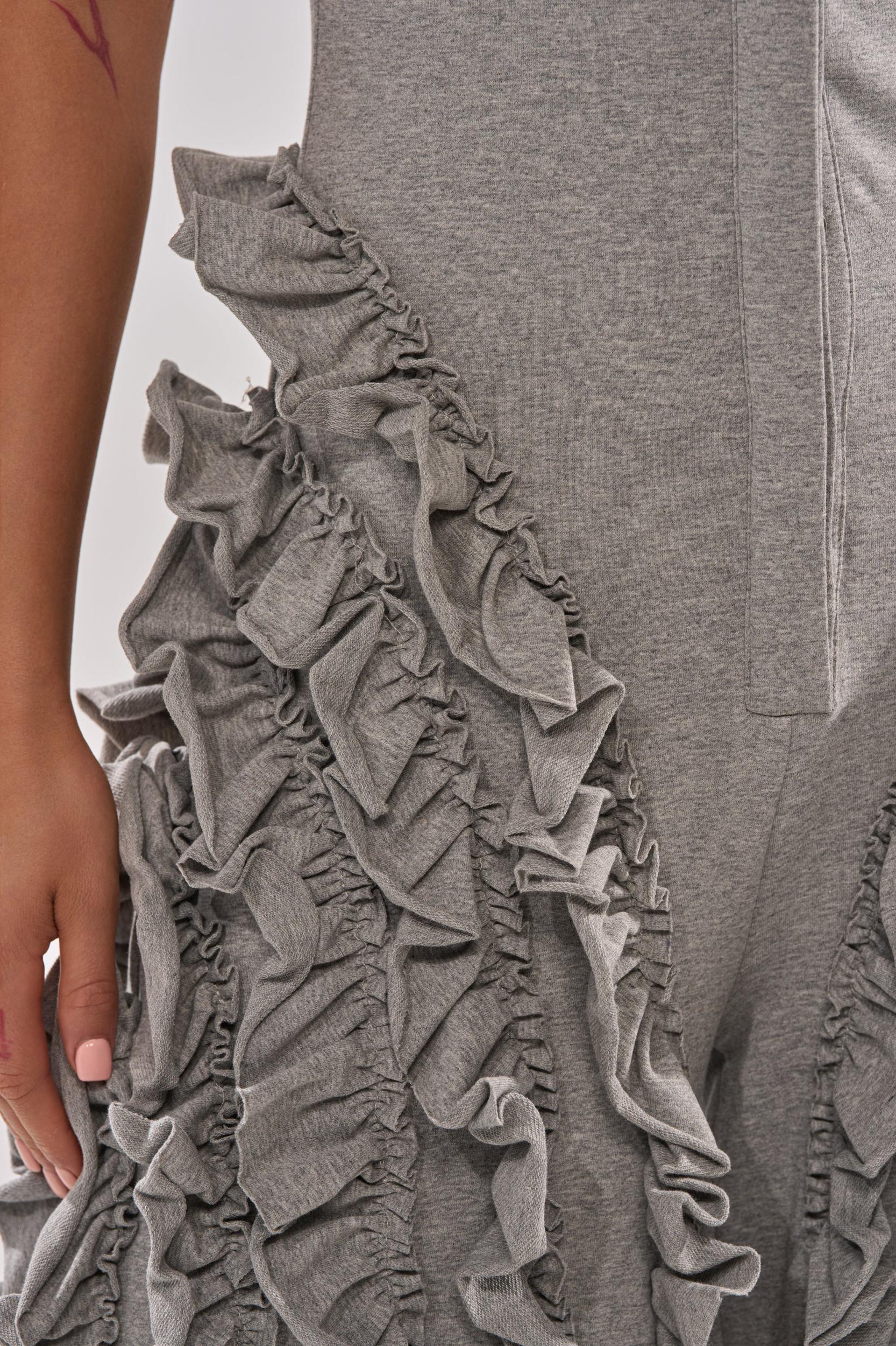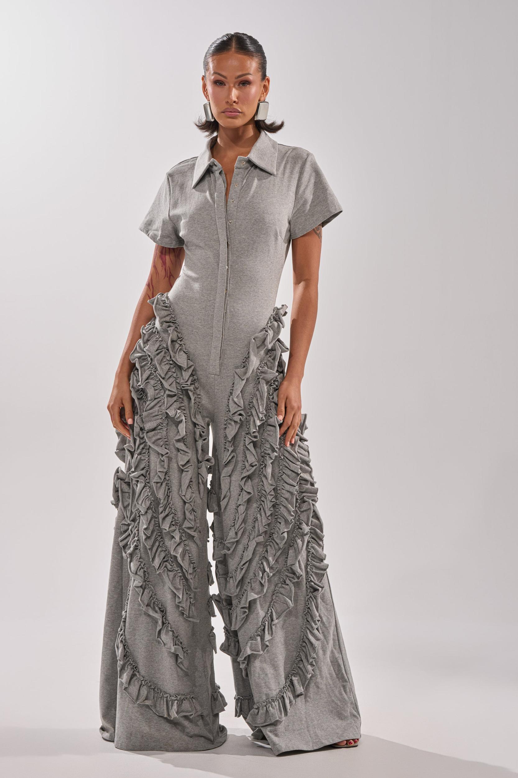 “Groutfits” can be chic! The AKIRA Label Leah Ruffle Jumpsuit boasts comfort and style with its soft heathered knit material and wide leg design. The bodice features a short sleeved collared silhouette with hidden front snap button enclosures, while the pant legs spice up the look with ruffled tiers for texture and flair. Pair with your favorite fuzzy boots and jacket for the perfect outfit to face the flurries! - 93% Cotton 7% Spandex- Stretchy - Imported (all measurements are approximate from size small)- 60” Shoulder to Hem- 15” Shoulder to Shoulder- 7” Sleeves- 32” Inseam- Model is 5’7” and wearing size smallProduct ID: 1075087 (all measurements are approximate from size 1X)- 65” Shoulder to Hem- 18” Shoulder to Shoulder- 9” Sleeves- 32” InseamProduct ID: 1075091