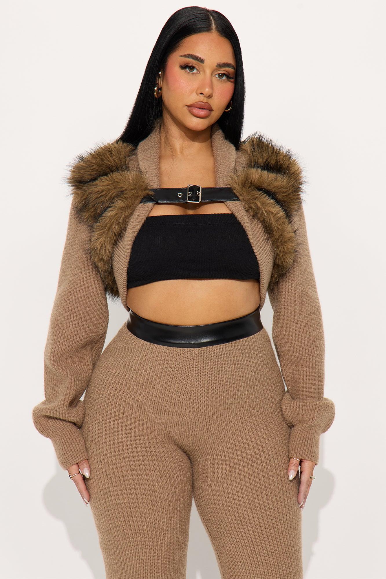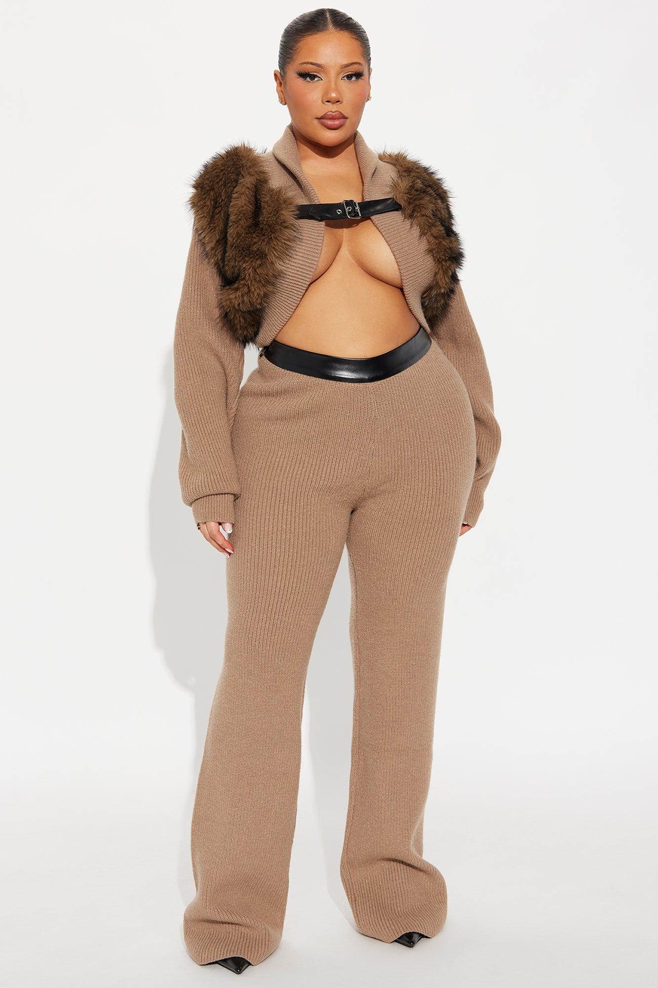 Available In Mocha. 2 Piece Ensemble Cardigan And Pant Set Stretch Belted Faux Fur Back Zipper Straight Leg 36" Inseam Self: 42% Acrylic 30% Polyester 28% Nylon Contrast1: 100% Polyester Contrast2: 50% Polyurethane 50% Polyester Lining: 100% Polyester Imported