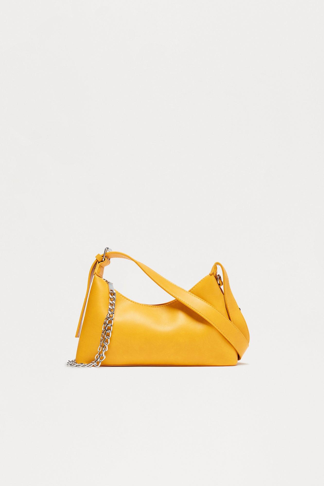 Available In Black And Yellow. Crossbody Bag Top Zip Closure Faux Leather Material Chain Detail Dimensions: 10.4"L x 2.5"D x 5.75"H Main Fabric: 100% Polyurethane Lining: 100% Polyester Imported