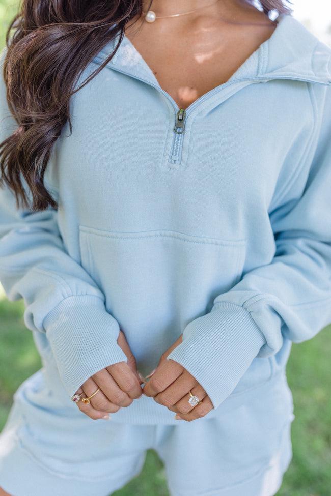 Details Blue Acid Wash Quarter Zip Relaxed fit Front pocket, zipper closure Pair this pullover with leggings and sneakers! Unlined Size small from shoulder to hem: 22.5" Material and Care 65% polyester 35% cotton Machine wash cold, tumble dry low Patterns may vary Materials may have natural variations Colors may vary from different viewing devices.
