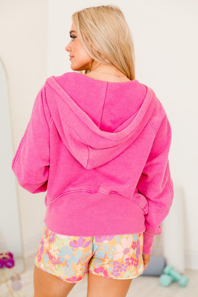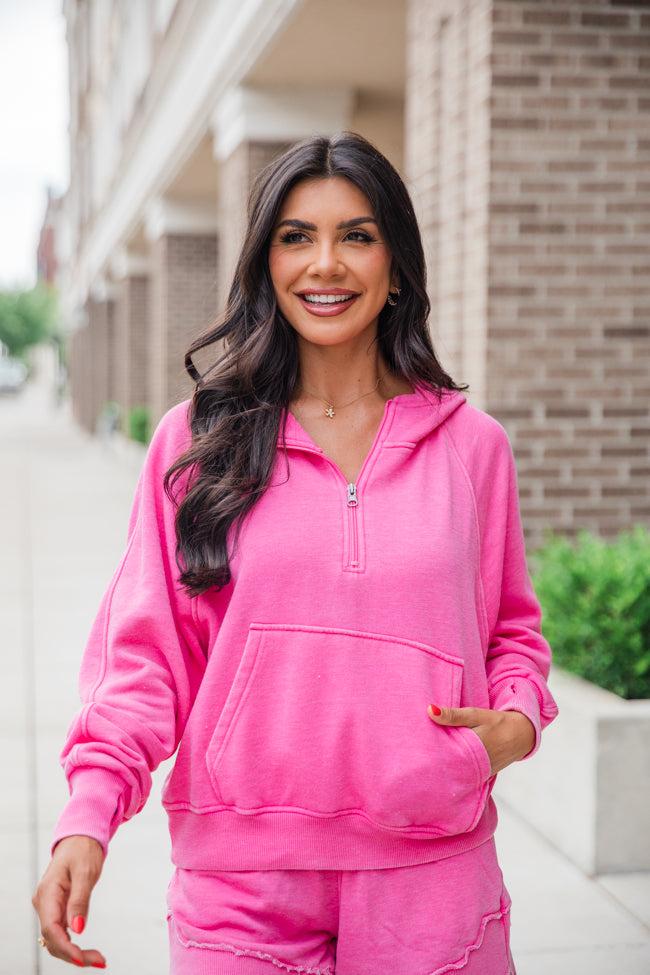 Details Pink Acid Washed Quarter Zip Pullover Relaxed fit Front pocket, zipper closure Pair this pullover with leggings and sneakers! Unlined Size small from shoulder to hem: 22.5" Material and Care 65% polyester 35% cotton Machine wash cold, tumble dry low Patterns may vary Materials may have natural variations Colors may vary from different viewing devices.
