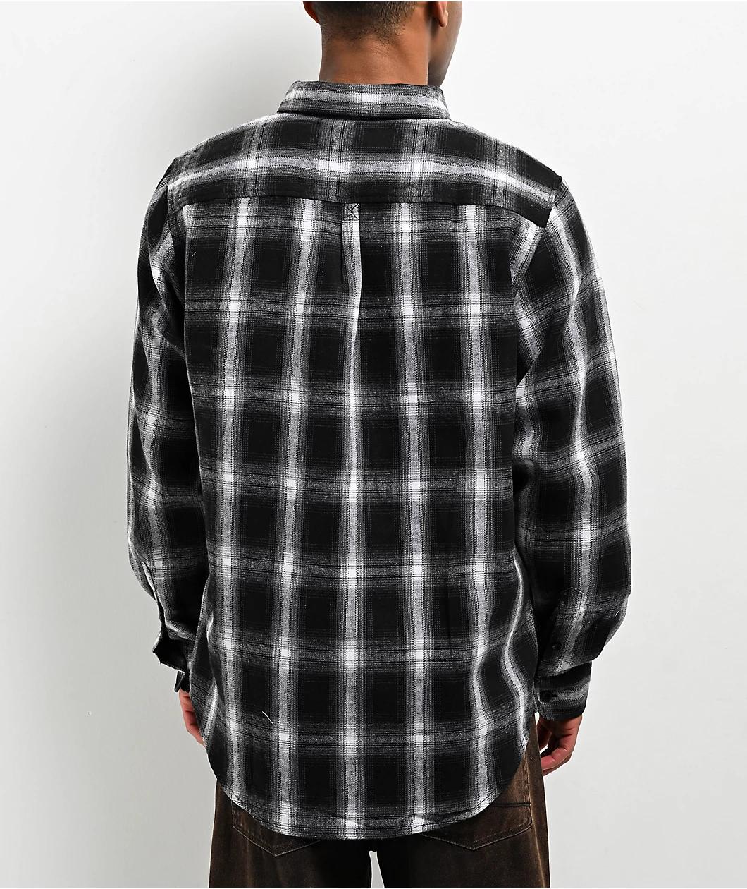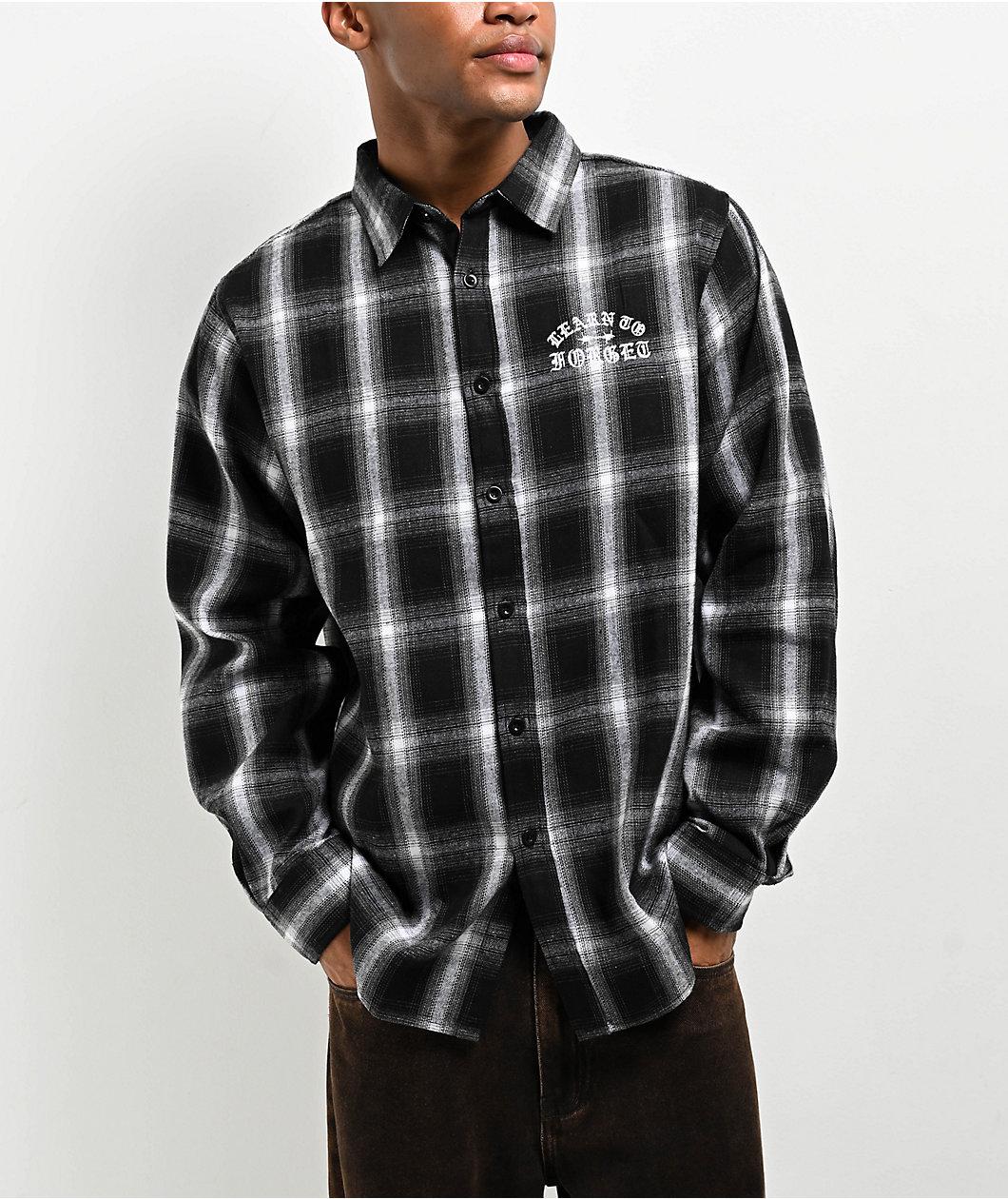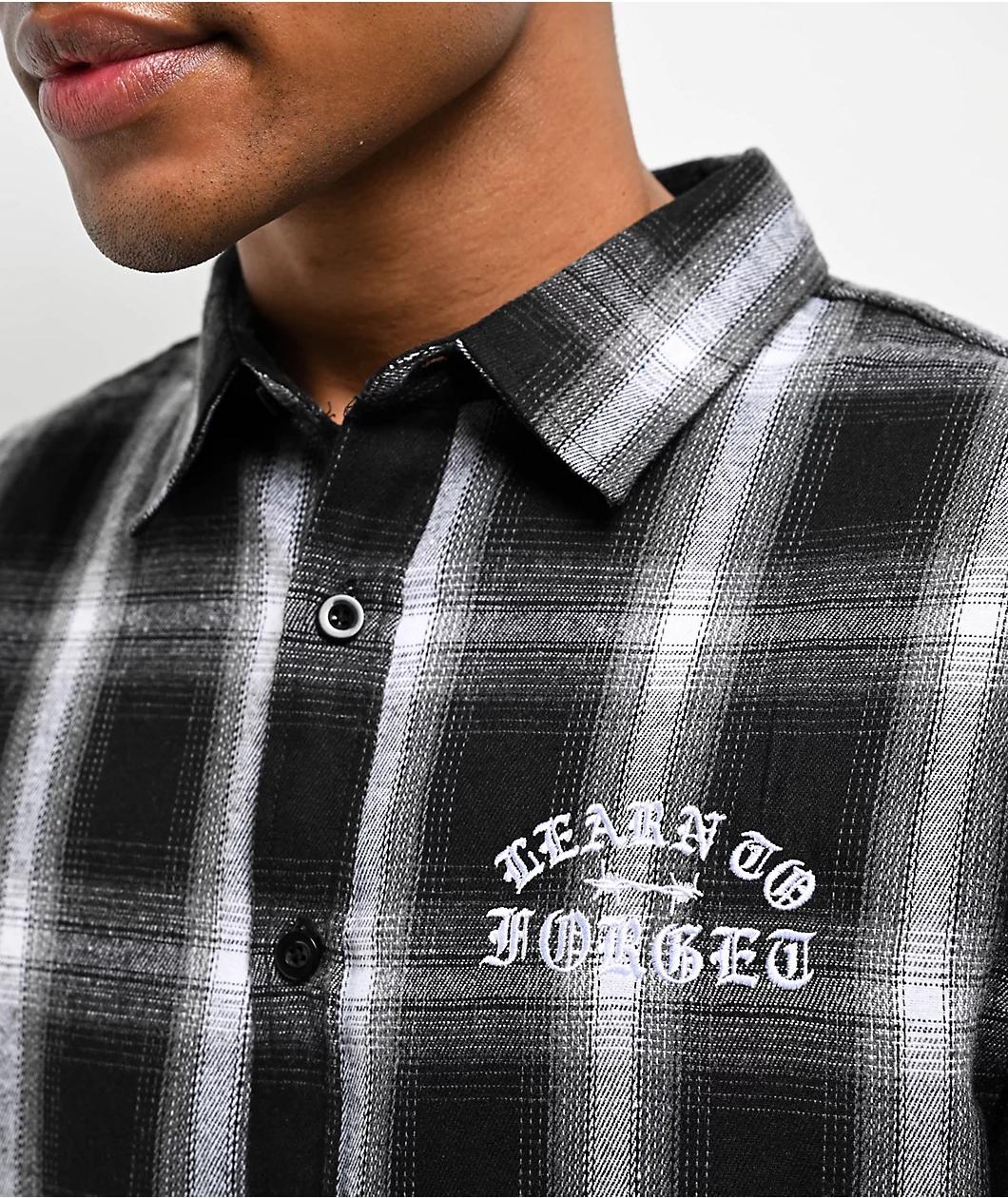 Arriving in a black, white, and grey plaid pattern, Learn To Forget introduces the Old English long sleeve flannel shirt. This long sleeve has an embroidered graphic on the left side of the chest depicting branding in Old English font with barbed wir