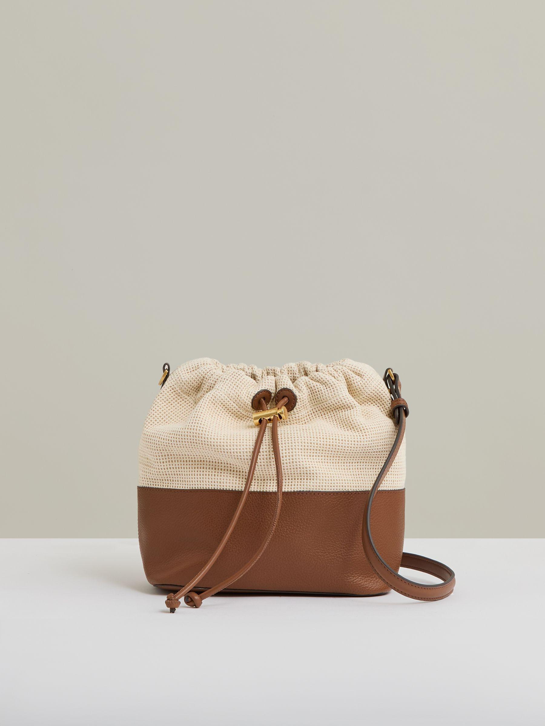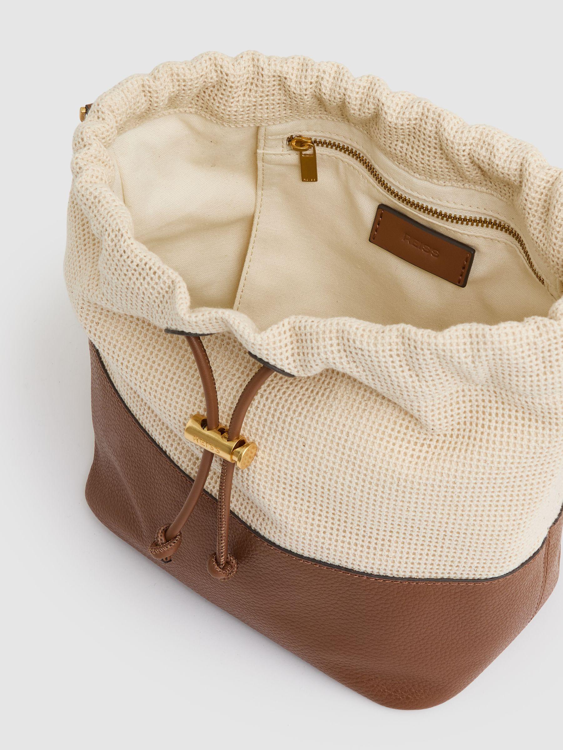 The Bernie bucket bag is crafted from a bold mix of pebbled leather and canvas with an openwork weave. An adjustable shoulder strap allows for versatile styling, while a drawcord closure secures with a logo-engraved metal toggle. Leather and canvas Toggle drawcord closure Removable, adjustable shoulder strap Cotton lining Internal zip pocket