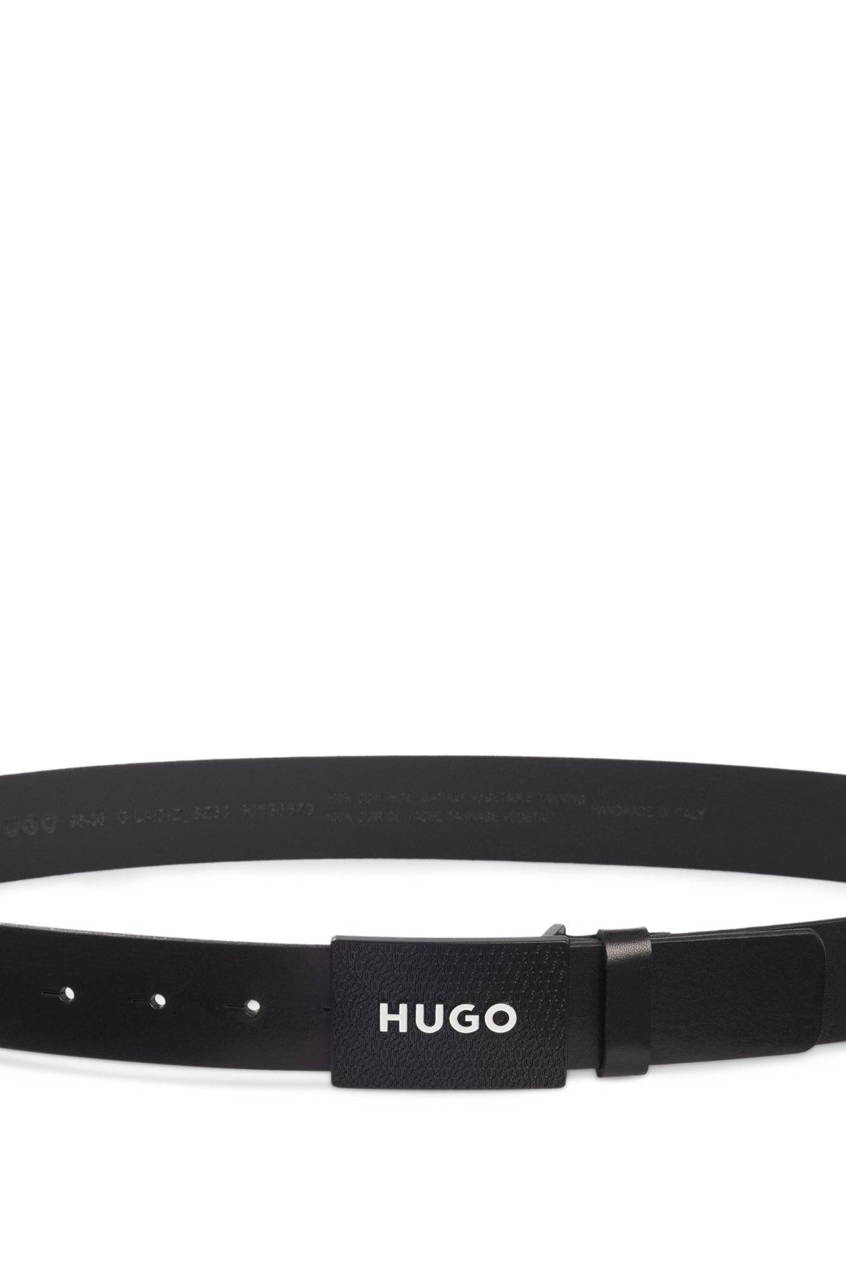 A signature belt by HUGO. Crafted in pull-up leather, this 3.5cm accessory features a plaque buckle with varied logo details. For the best fit, we advise ordering a belt one size larger than your waist size.