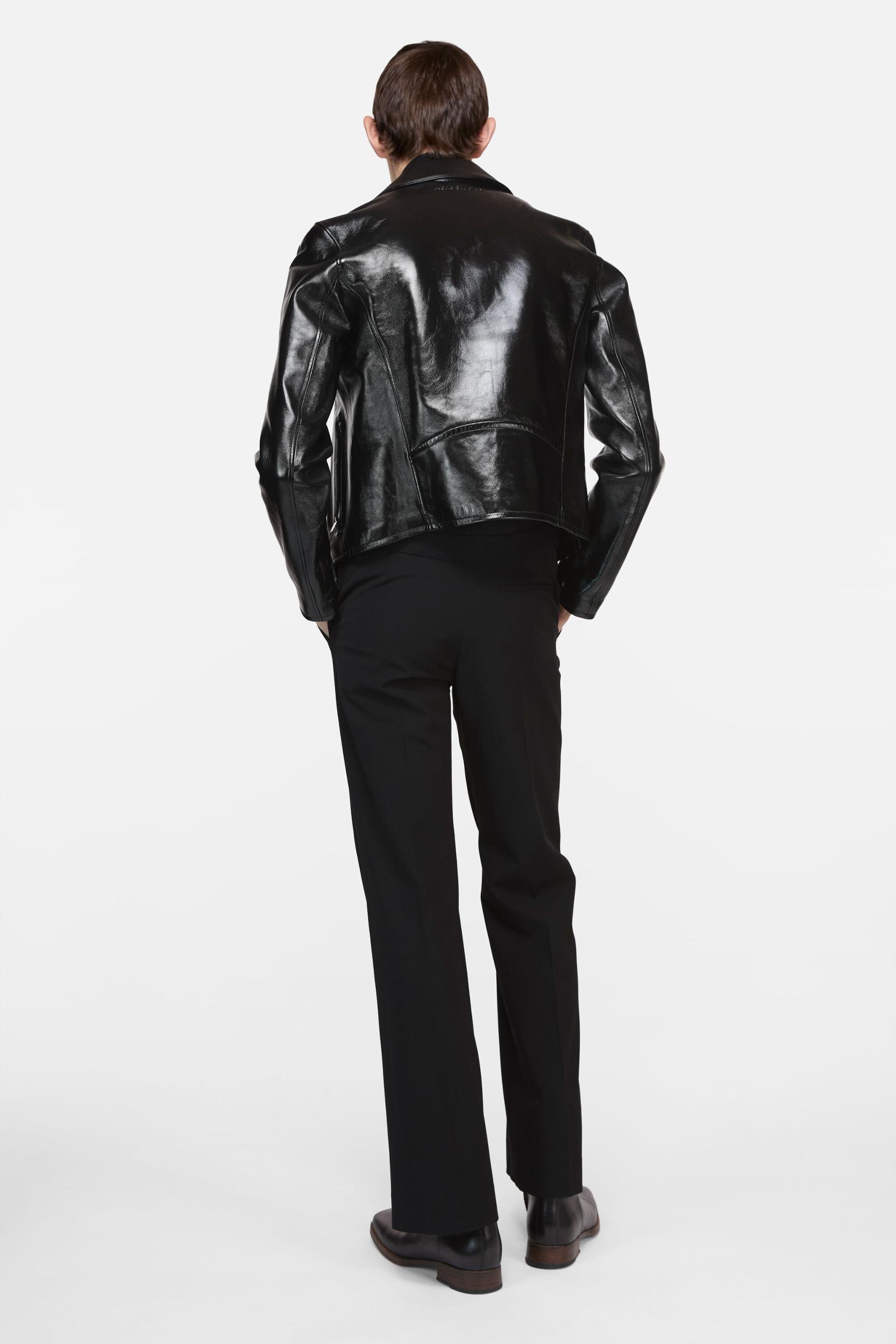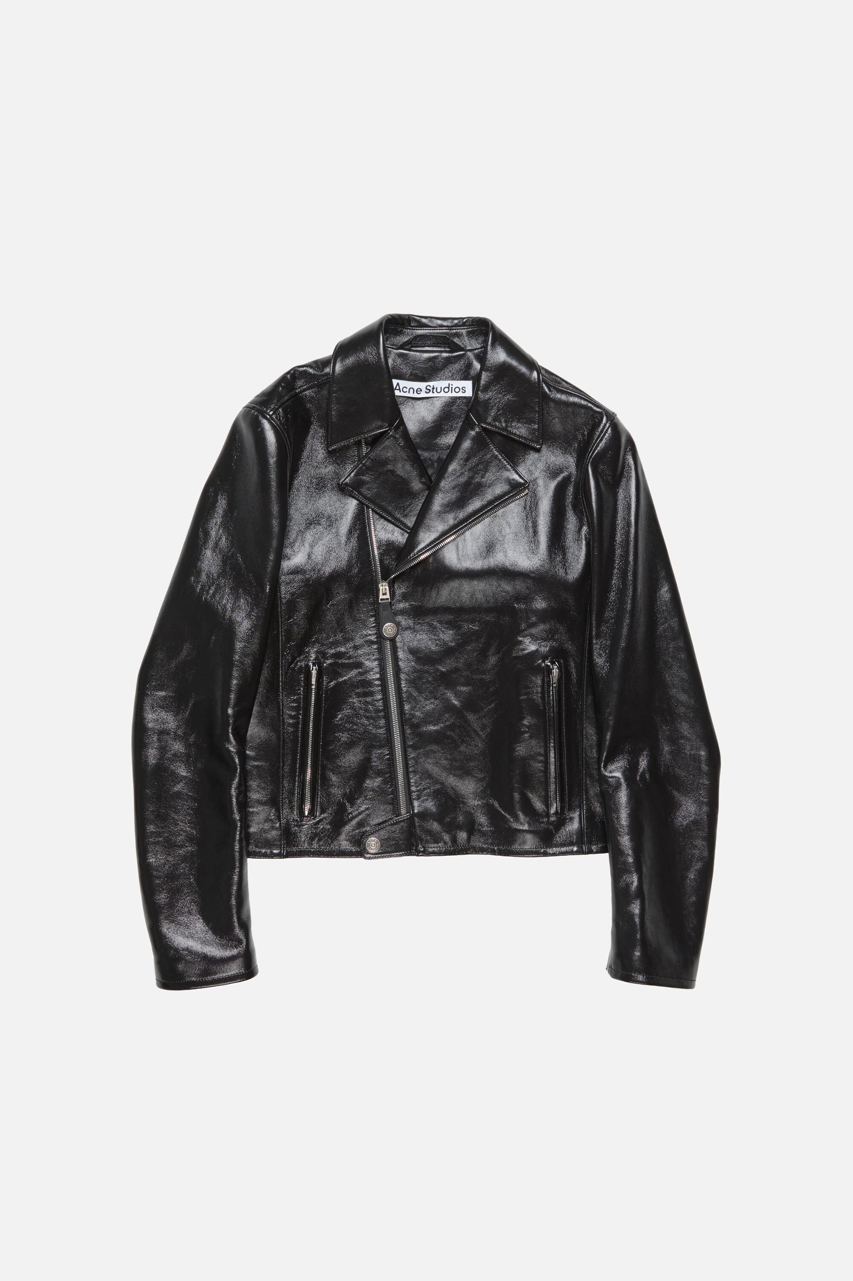 Biker jacket crafted from soft lamb leather with a shiny finish. Features branded metal zip closure, side pockets with hidden zippers, a tab with visible snap button, and zipped sleeves. Finished with an embossed logo on the back neckline. Cut to a regular fit and below-waist length. FN-MN-LEAT000320