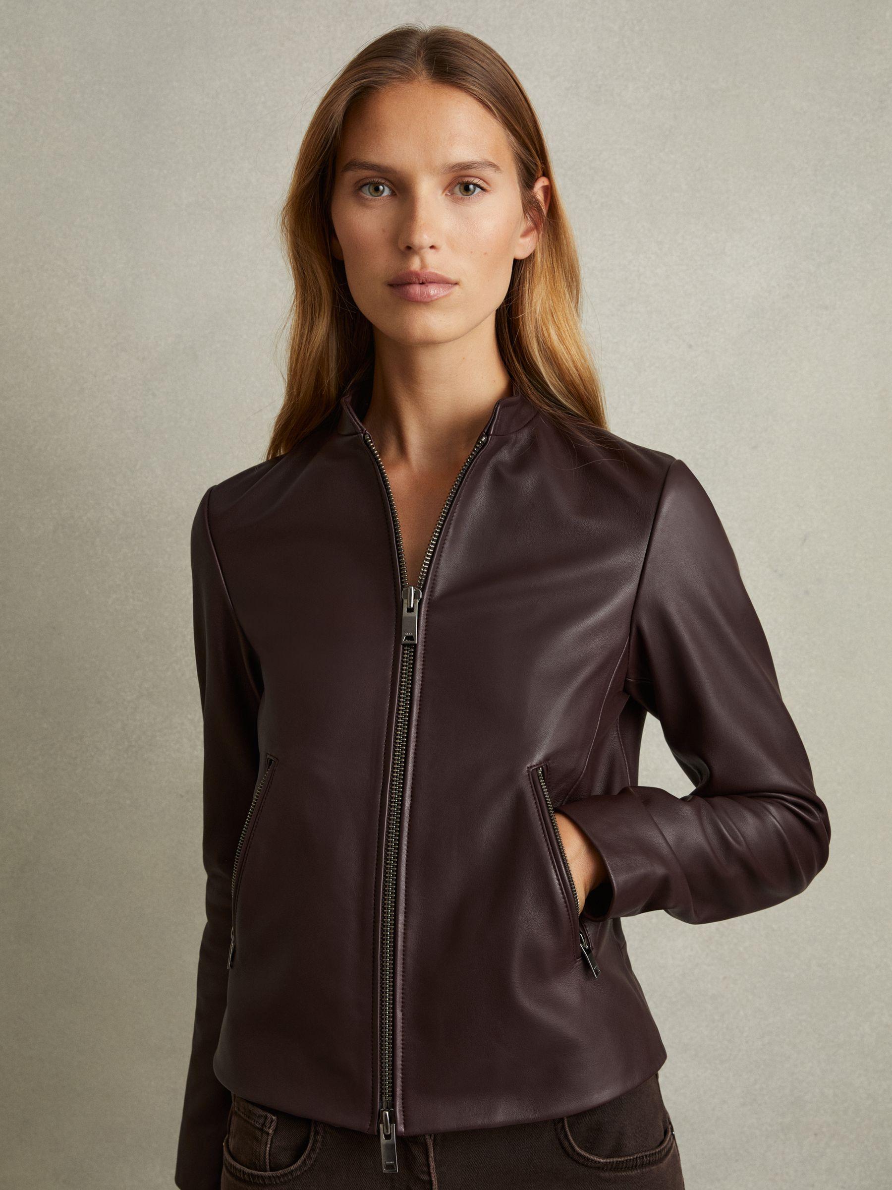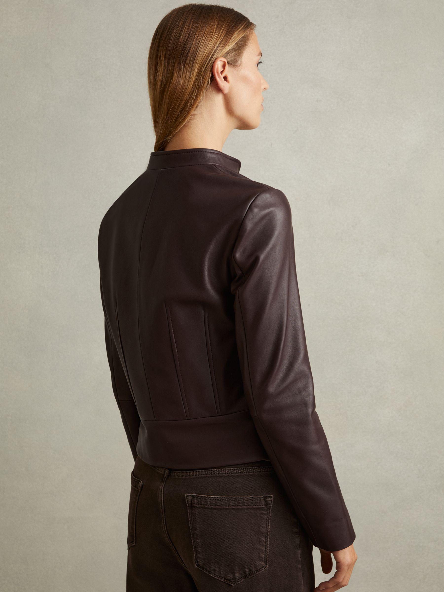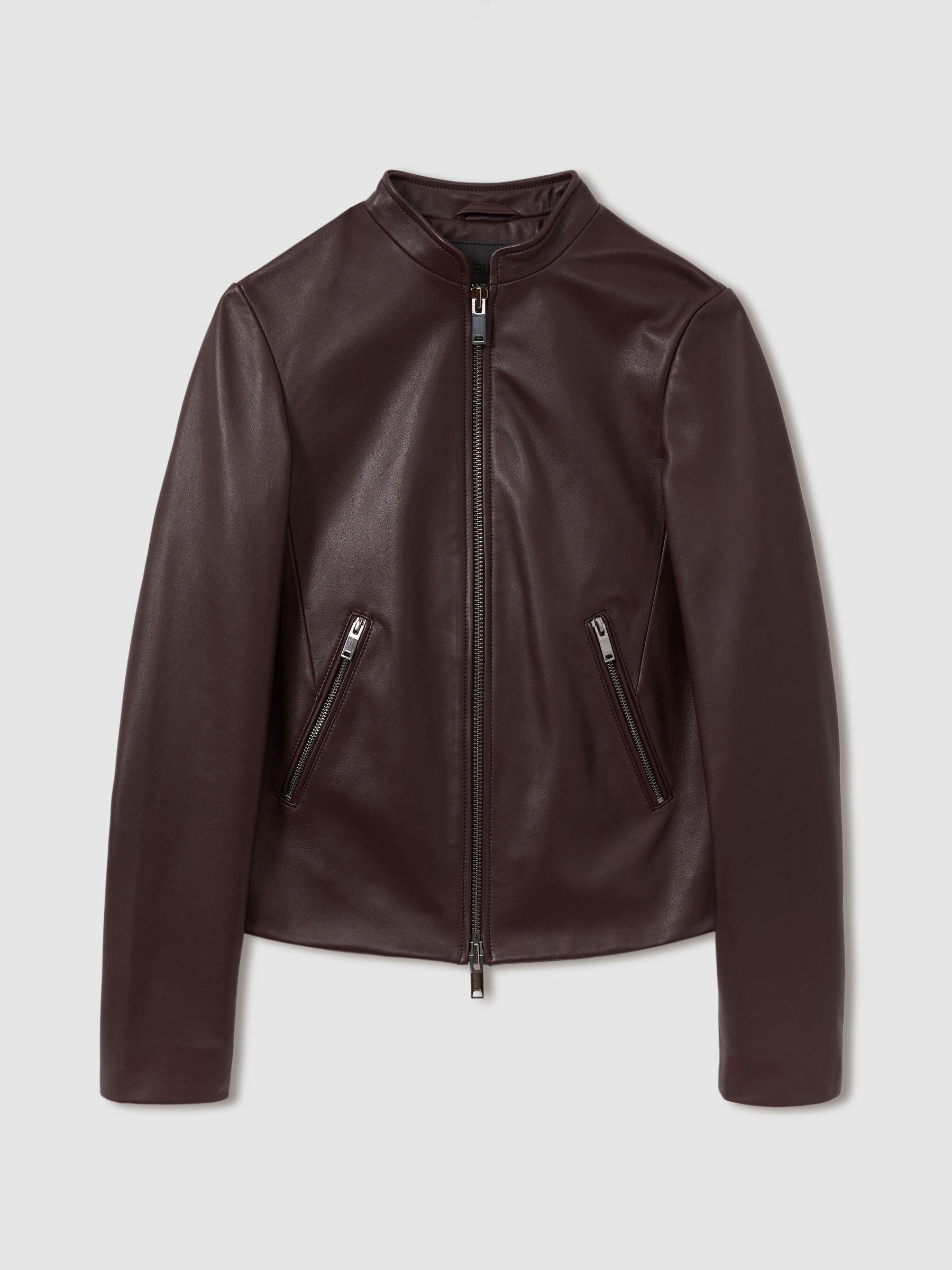 Sleek in silhouette with a collarless neckline, the Allie leather jacket is a modern riff on a wardrobe hero. It's designed from a butter-soft leather and is fully lined for comfort. A double-ended zip lends any off-duty edit a tough-luxe edge. Collarless. Double-ended zip. Zip pockets. Slim fit. The model is wearing a size 8. Measurements of model: Height 5ft 9" / 175cm.