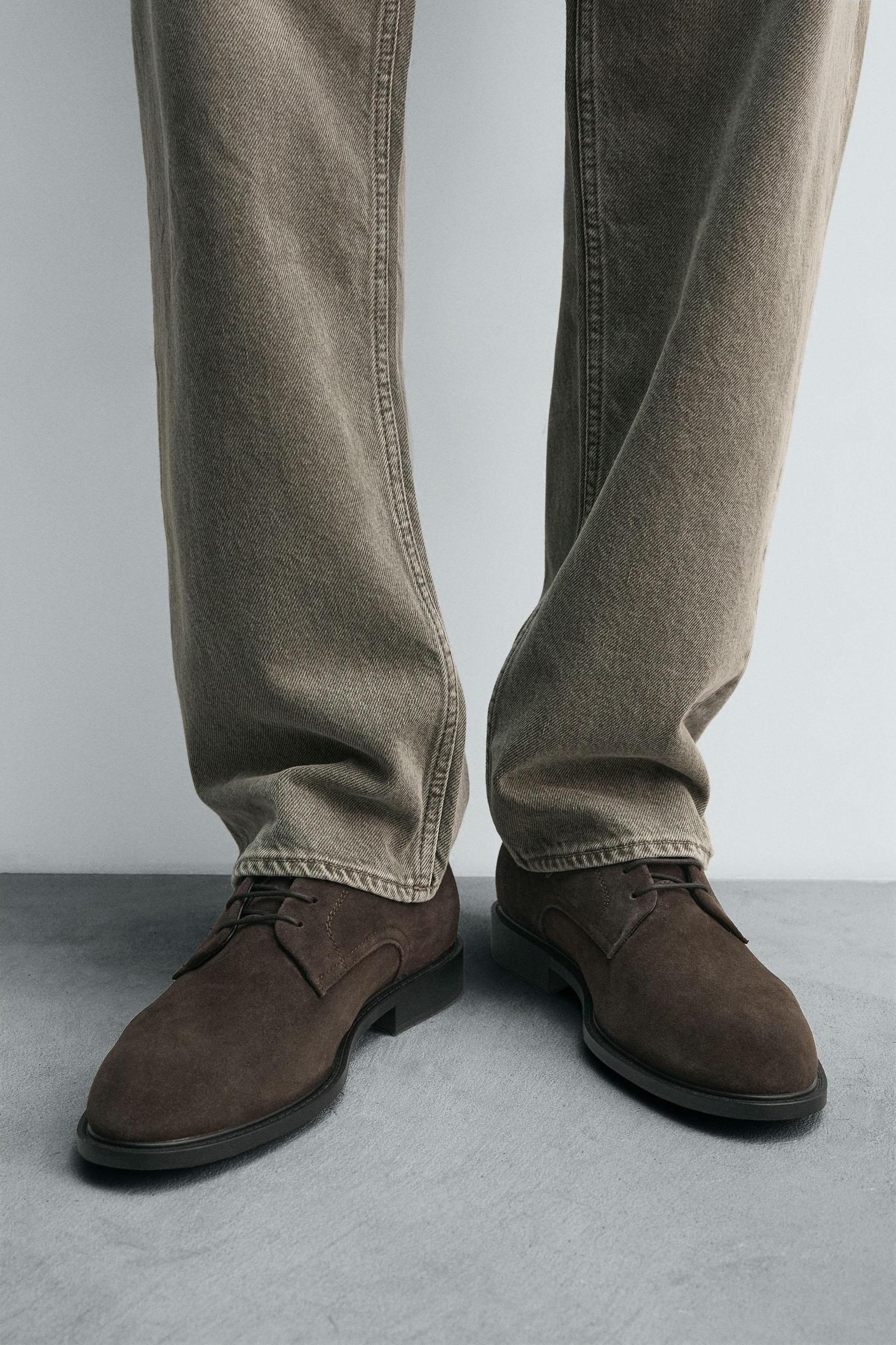 Derby dress shoes. Uppers made of split leather. Rounded shape. Matching sole with low heel.