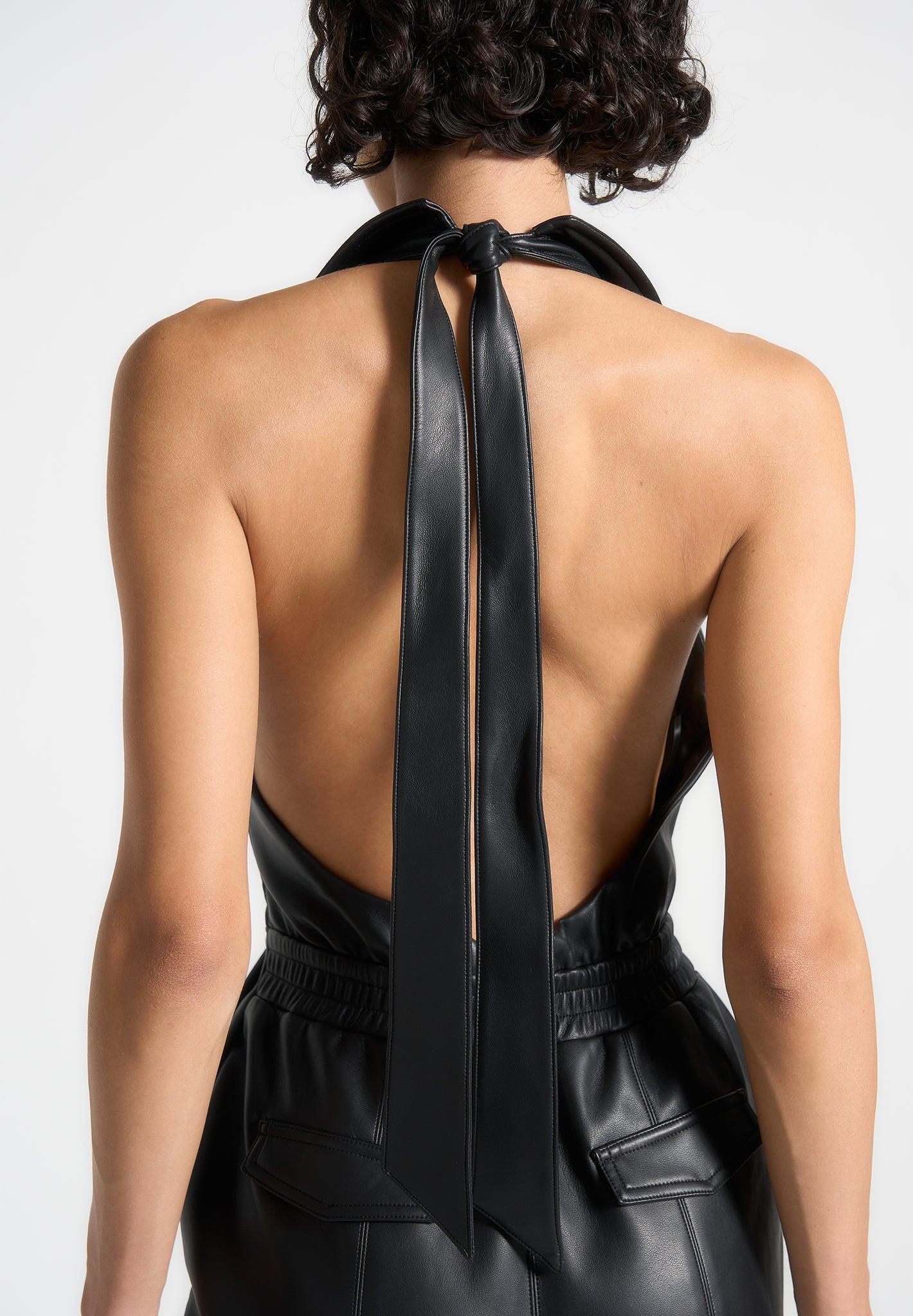 Stay chic with our Leather Halterneck Cargo Jumpsuit. Featuring cargo pockets and leg straps for added functionality, a tie neck for a touch of elegance, and an open back for a daring edge. Perfect for any occasion, this jumpsuit combines style and practicality in one stunning piece. Jumpsuit Silhouette Vegan Leather Self Tie at Neck Front Zip Feature Cargo Pockets Elasticated Waistband Silver Manière De Voir Eiffel 55% Polyester, 45% PUAlways check the care label for wash instructions.