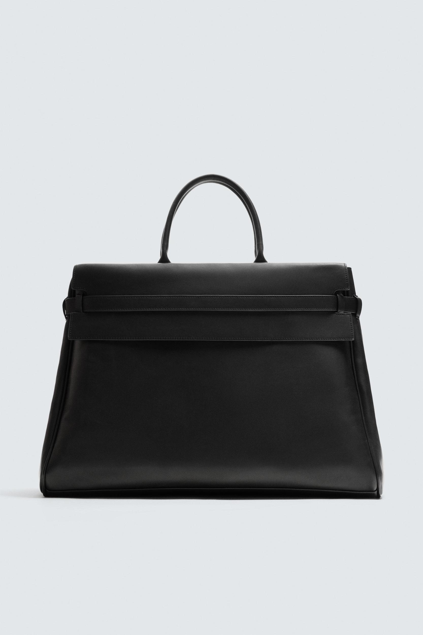Extra-large handbag made of high-quality leather. Main compartment with magnetic closure. The interior has a pocket with zipper closure. Secondary pocket with flap closure and ribbon detail. Leather handles.