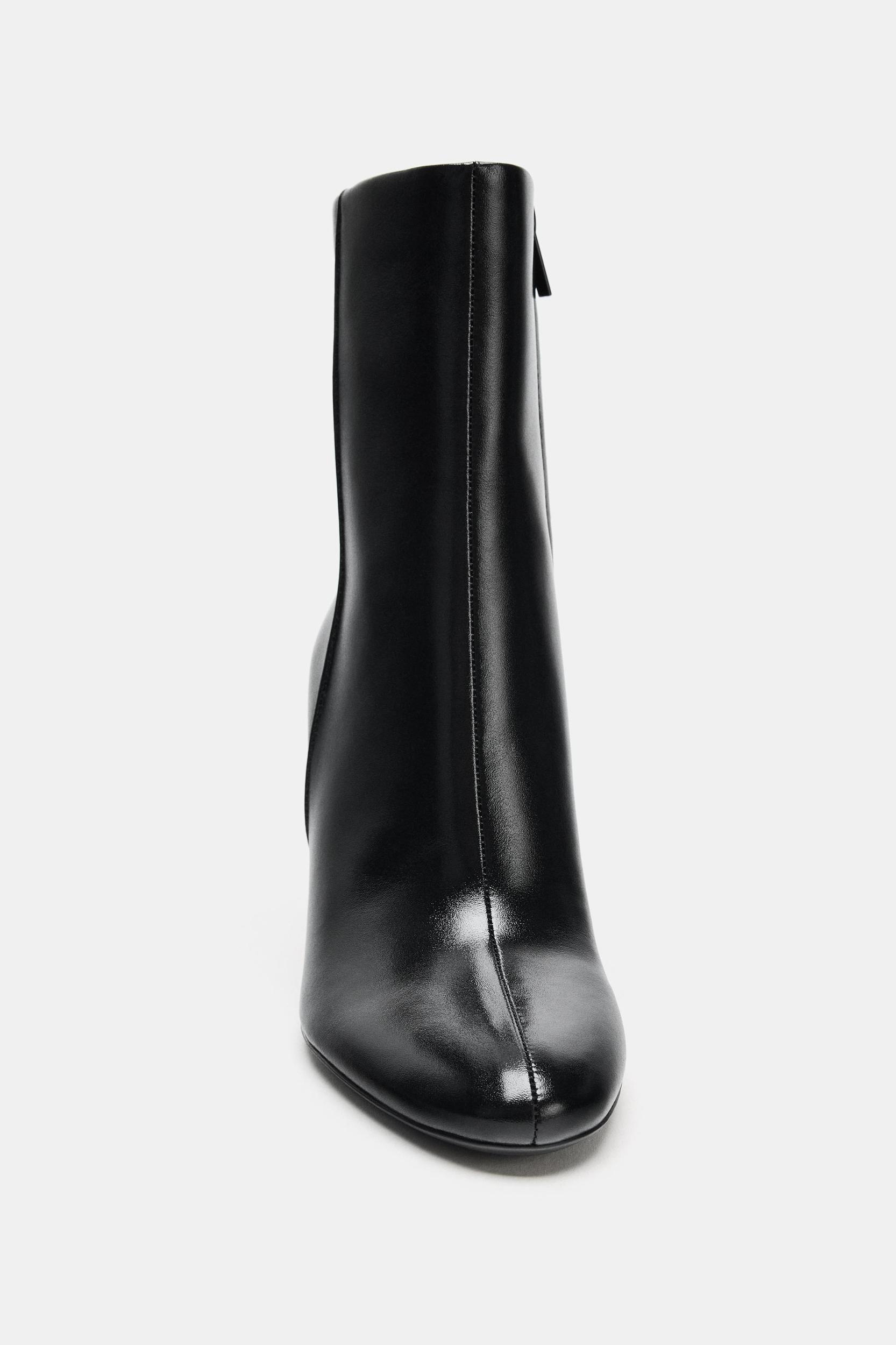 Leather ankle boots. Mid-height shaft. Side zip closure. Stiletto high heel. Rounded toe. Heel height: 3.5 inches (9 cm)