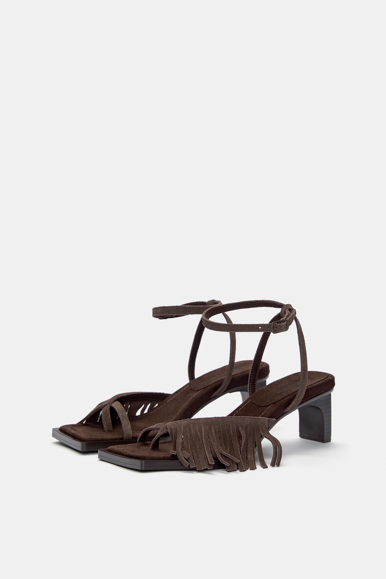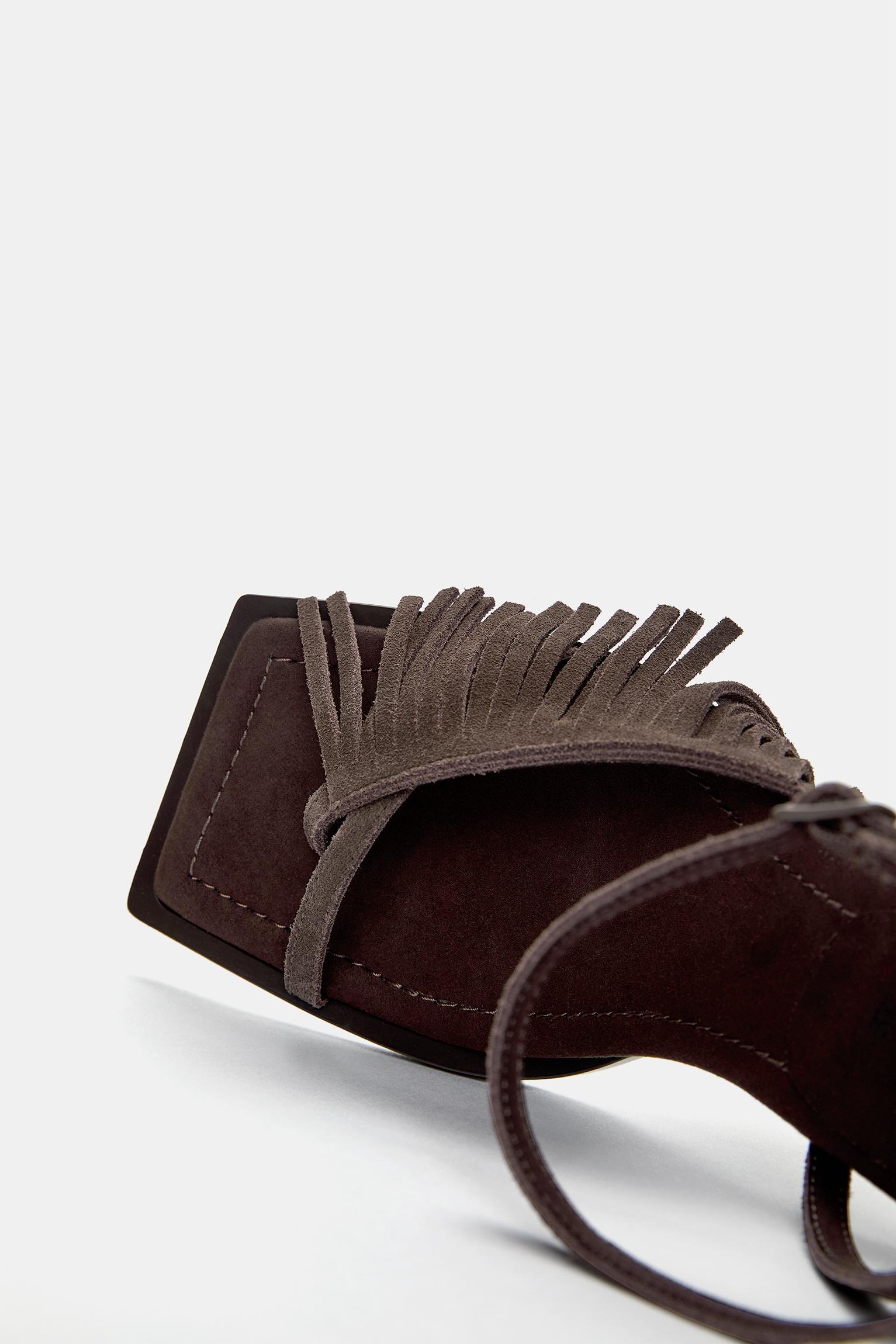 Leather heeled sandals with a split leather finish. Available in brown. Fringe detail. Square toe. Buckled ankle strap fastening. AIRFIT® insole Heel height: 7 cm.