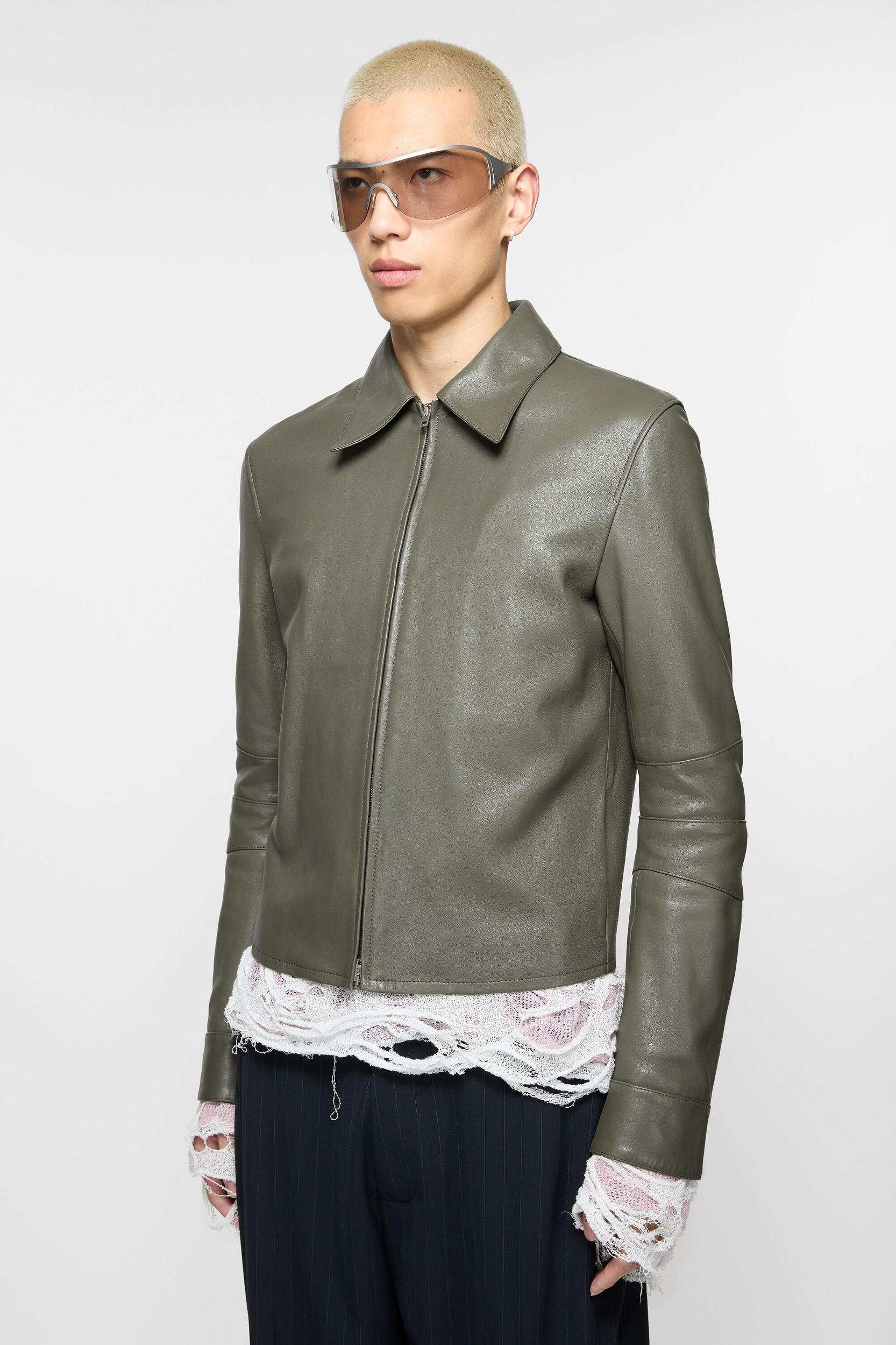 Jacket crafted in semi-shine finish leather, complete with 2-way zipper closure. Cut to a fitted fit and below hip length. FN-MN-LEAT000285