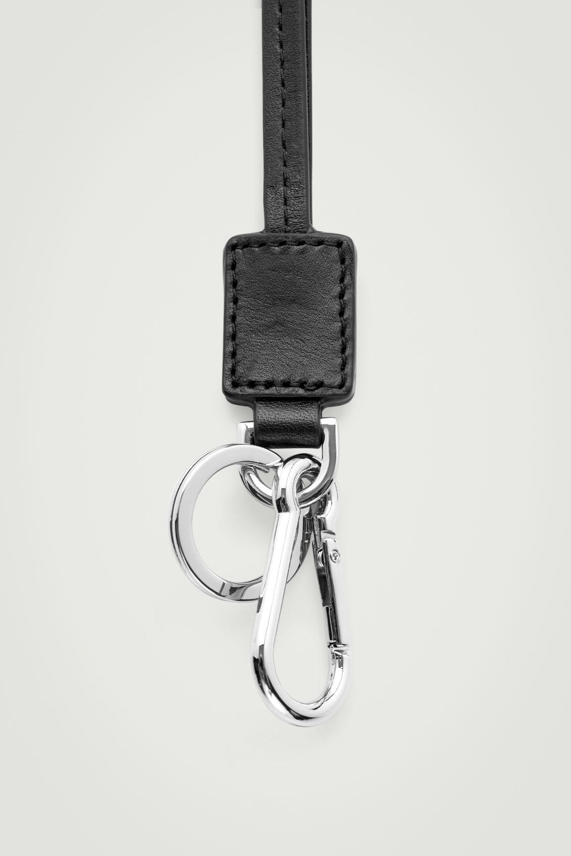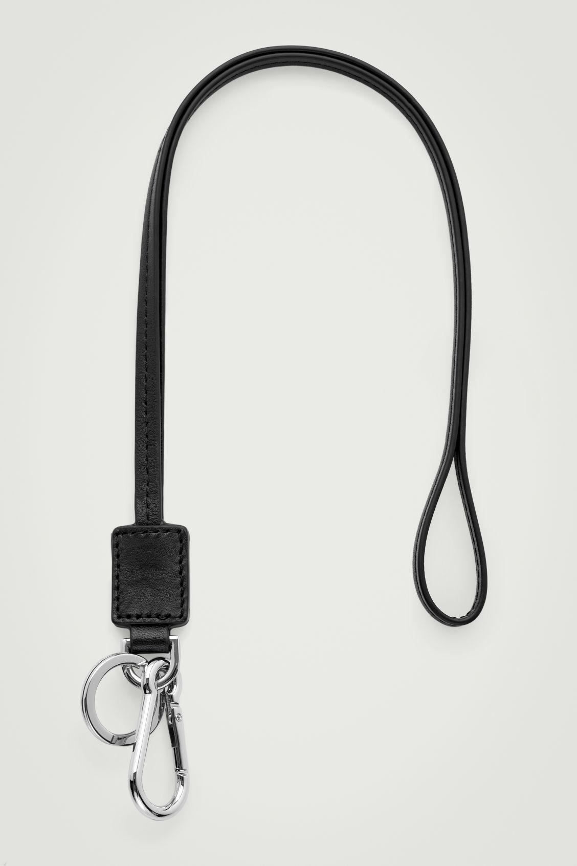 This lanyard is a pragmatic tool: it features a keyring and dog clip to keep your valuables within reach. The strap is crafted from bonded leather that's resistant to scratches and tanned classic black using chrome-free dye. Carry it around your neck or tie it to the handle of your bag. COS supports responsible manufacturing via the Leather Working Group Shell: 100% Leather. Excluding trims