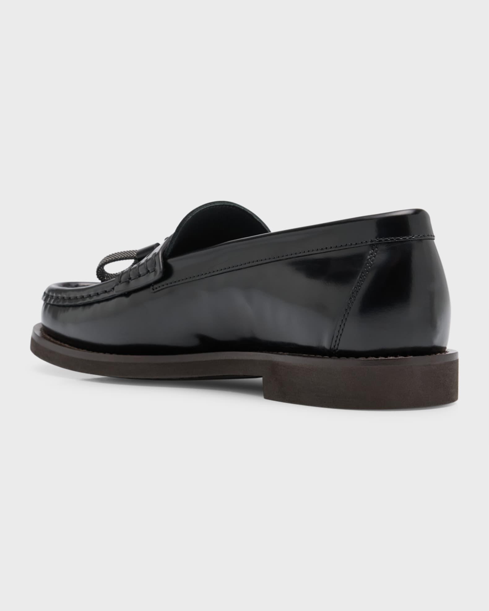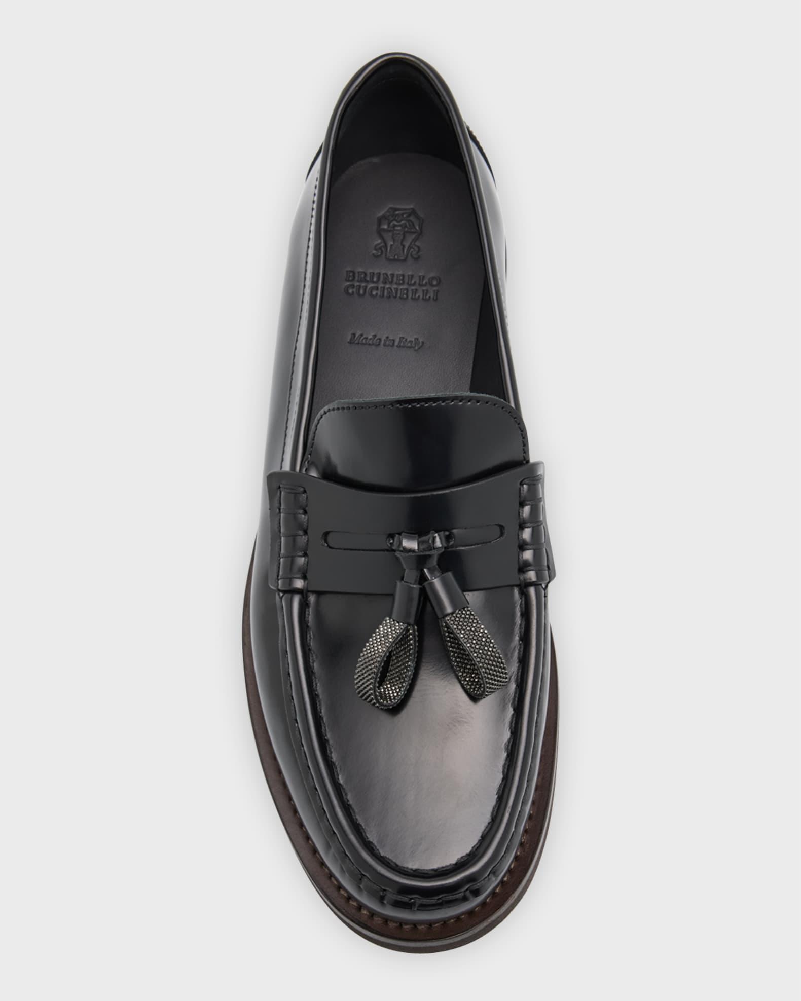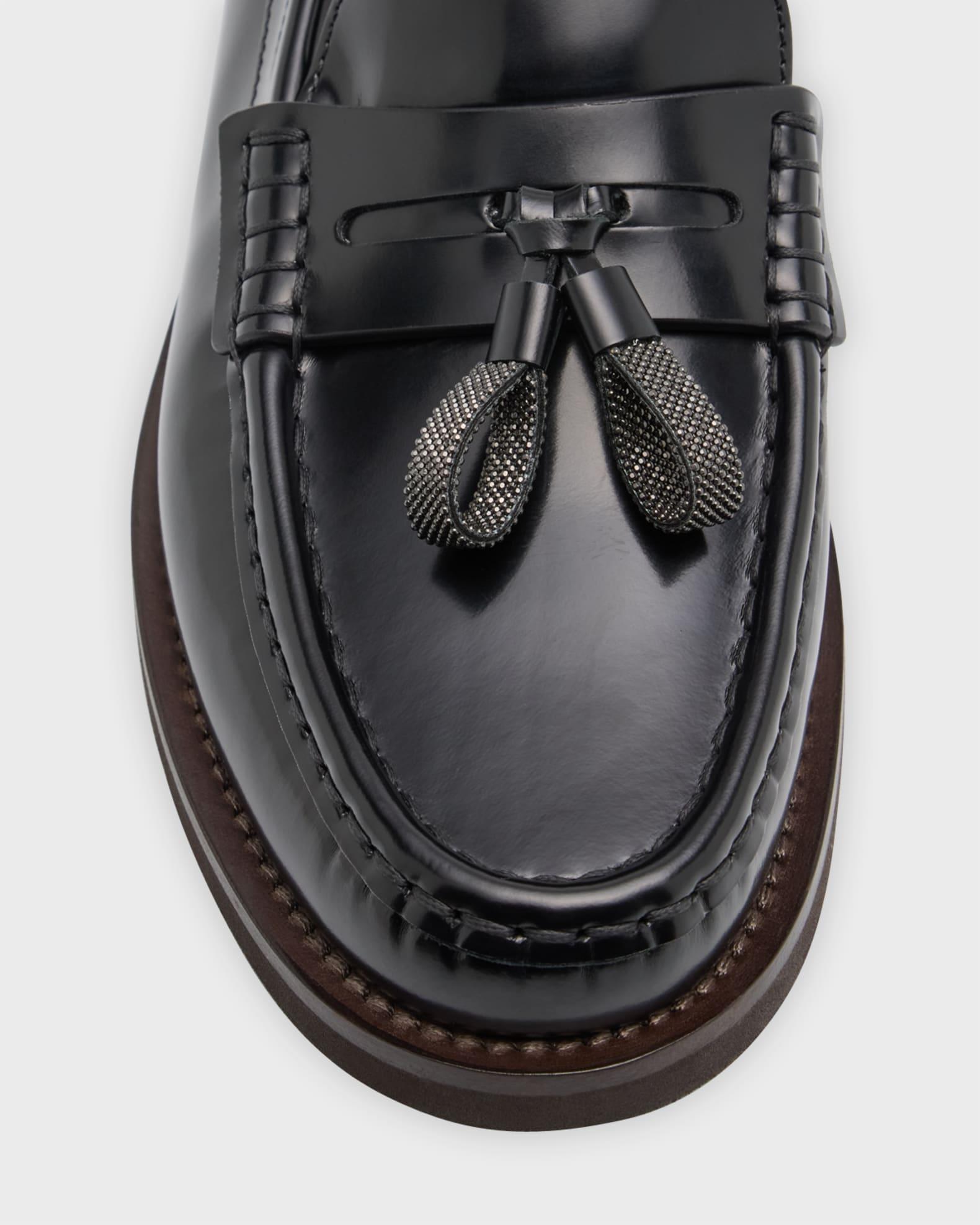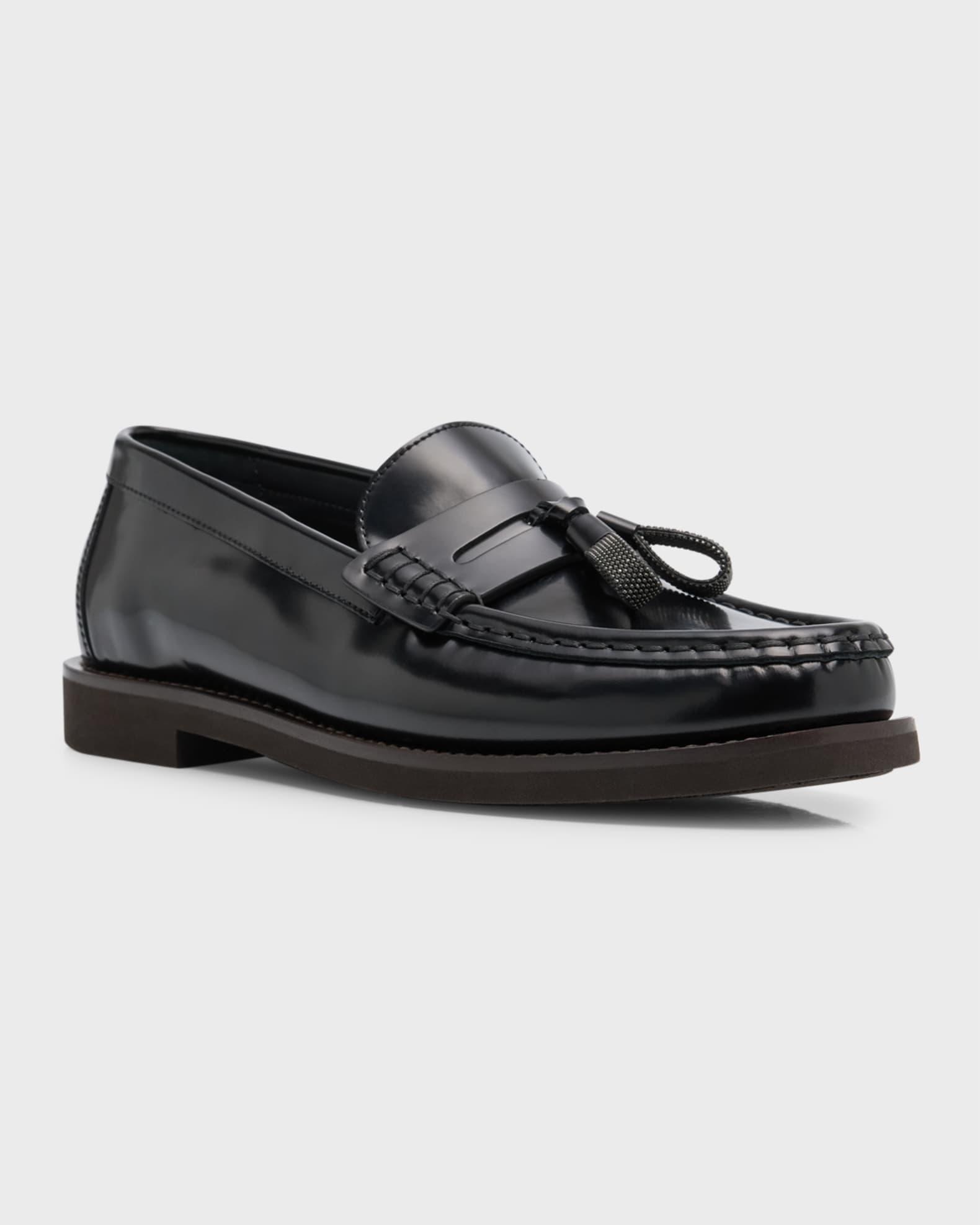 Brunello Cucinelli leather penny loafers with monili embellished tassel accent Flat heel Round moc toe Notched vamp with keeper strap Slip-on style Leather outsole Lining: Leather Made in Italy