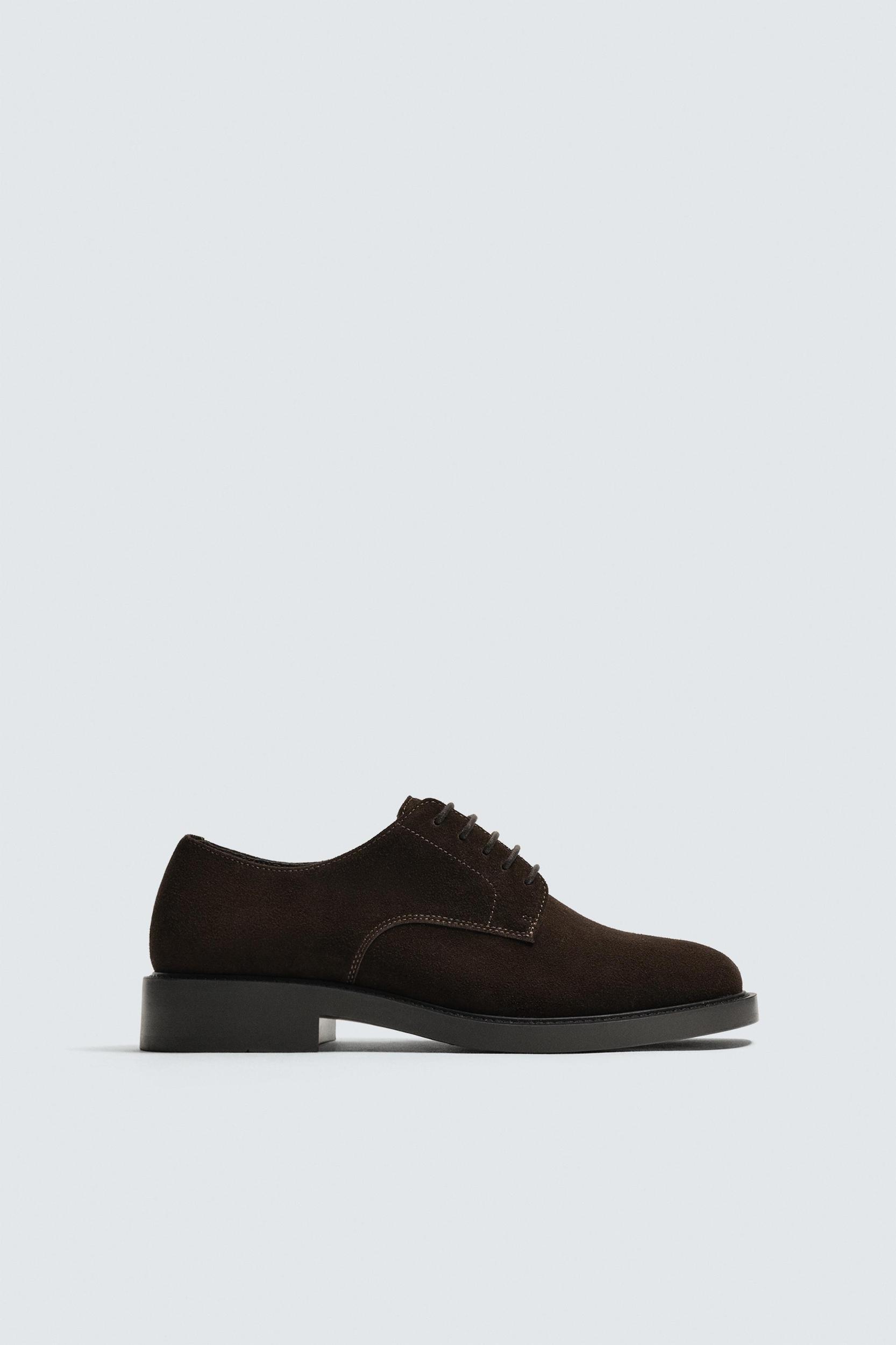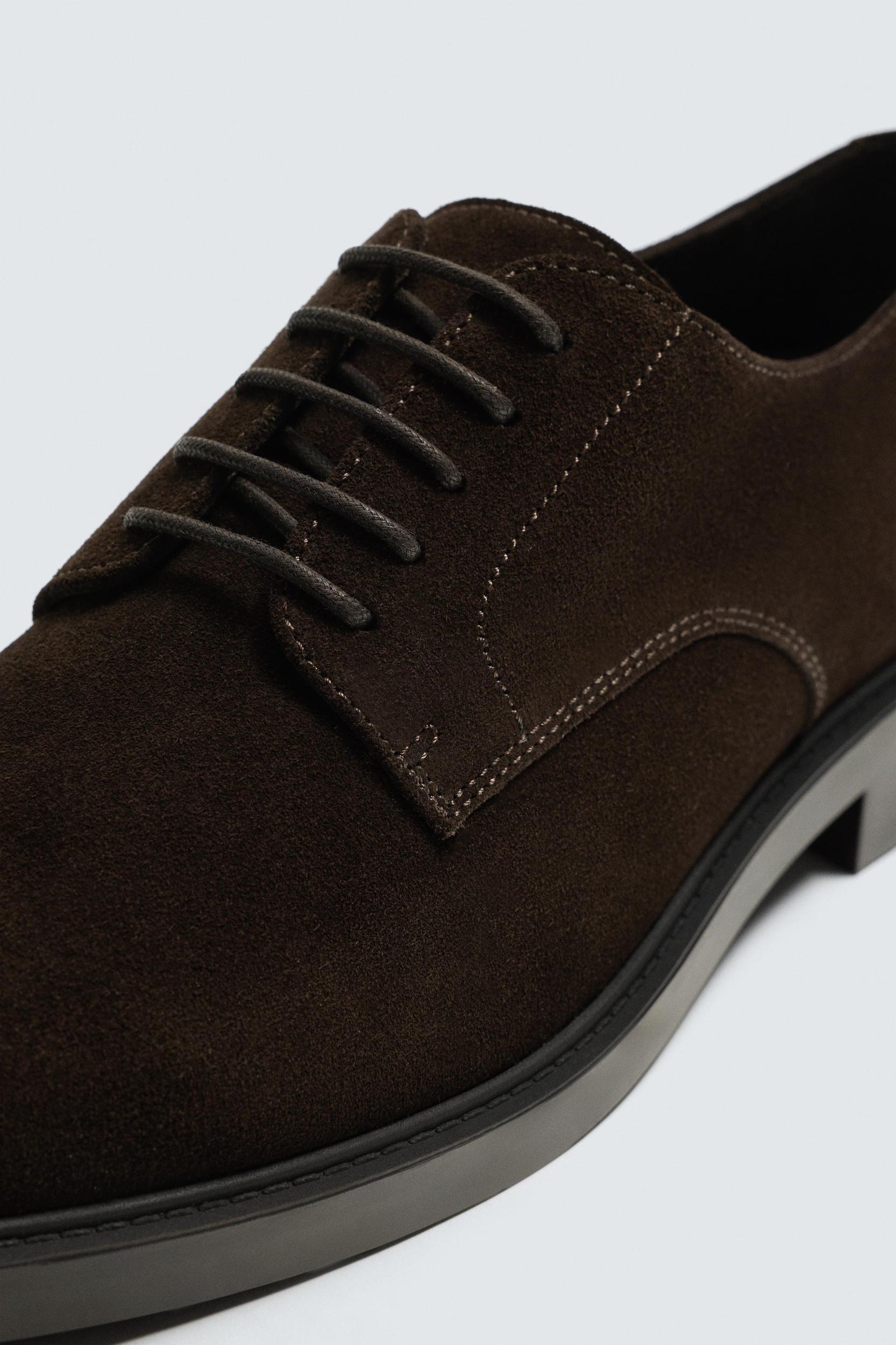 Laced derby shoes. Leather upper with a split suede finish. Round toe. Contrasting sole.