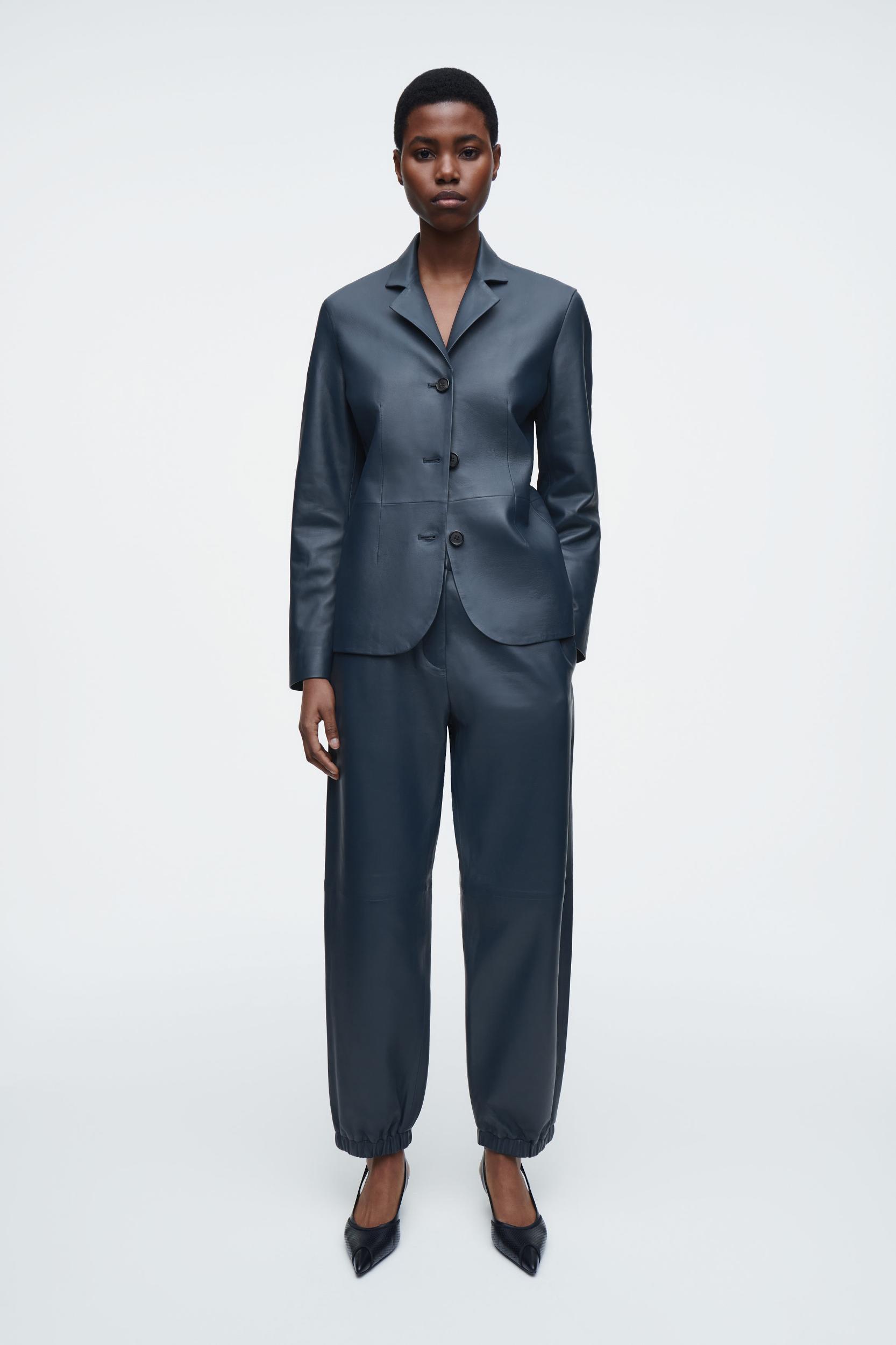 Refining tailoring codes, this sophisticated blazer is crafted from butter-soft leather and rendered in a rich midnight-navy tone. It's tailored in a classic single-breasted silhouette with shaped seams and a clean buttoned placket. Style it with the coordinating trousers for a tonal look. Regular fitButton closureCOS supports responsible manufacturing via the Leather Working Group Shell: 100% Leather. Lining: 100% Viscose. Excluding trims / Specialist clean Back length of size EU 36 is 66.5cm / Model wears a size EU 36