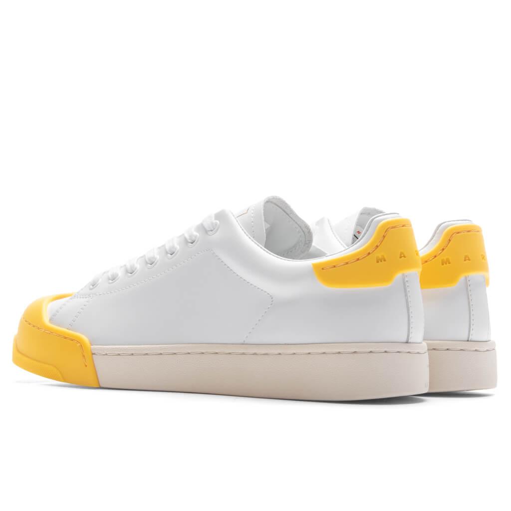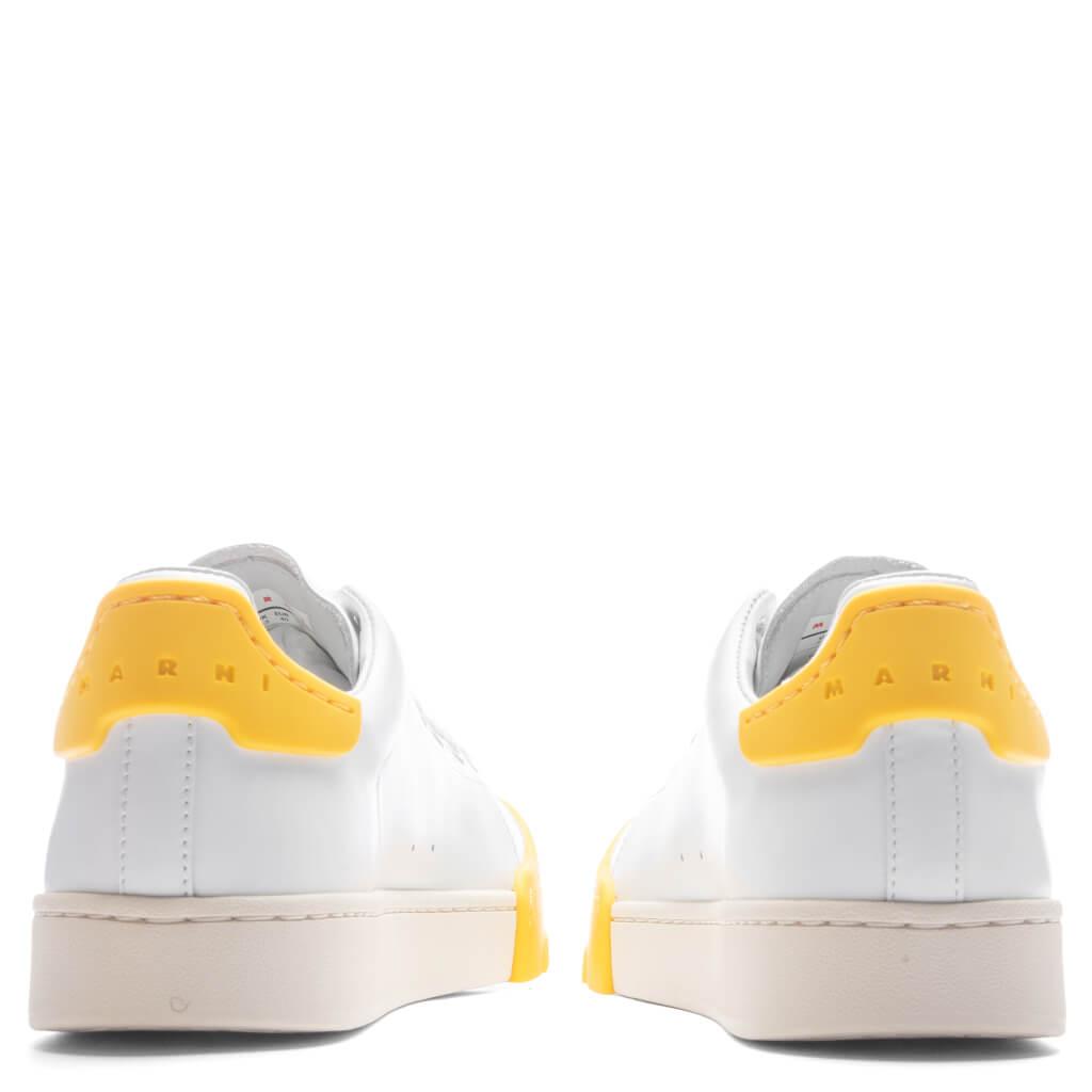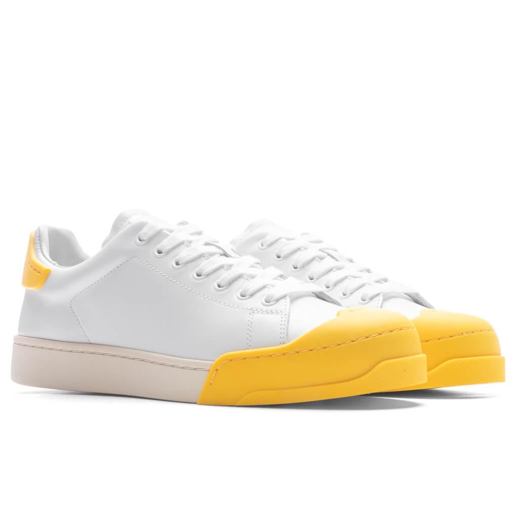 Marni’s contemporary aesthetics make a statement in the Dada Bumper Low-Top Sneakers. Featuring a calf leather upper, the sneaker takes on a toe and heel rubber hit with additional branding. The leather insole and lining provides additional comfort, while the branding on the tongue and rubber outsole finish the look. Calf leather upper Lace-up front Toe box/heel rubber detailing Leather lining/insole Rubber outsole All sizes are listed in European Men’s sizing unless stated otherwise Style No: SNZU013401 P5249 ZO433