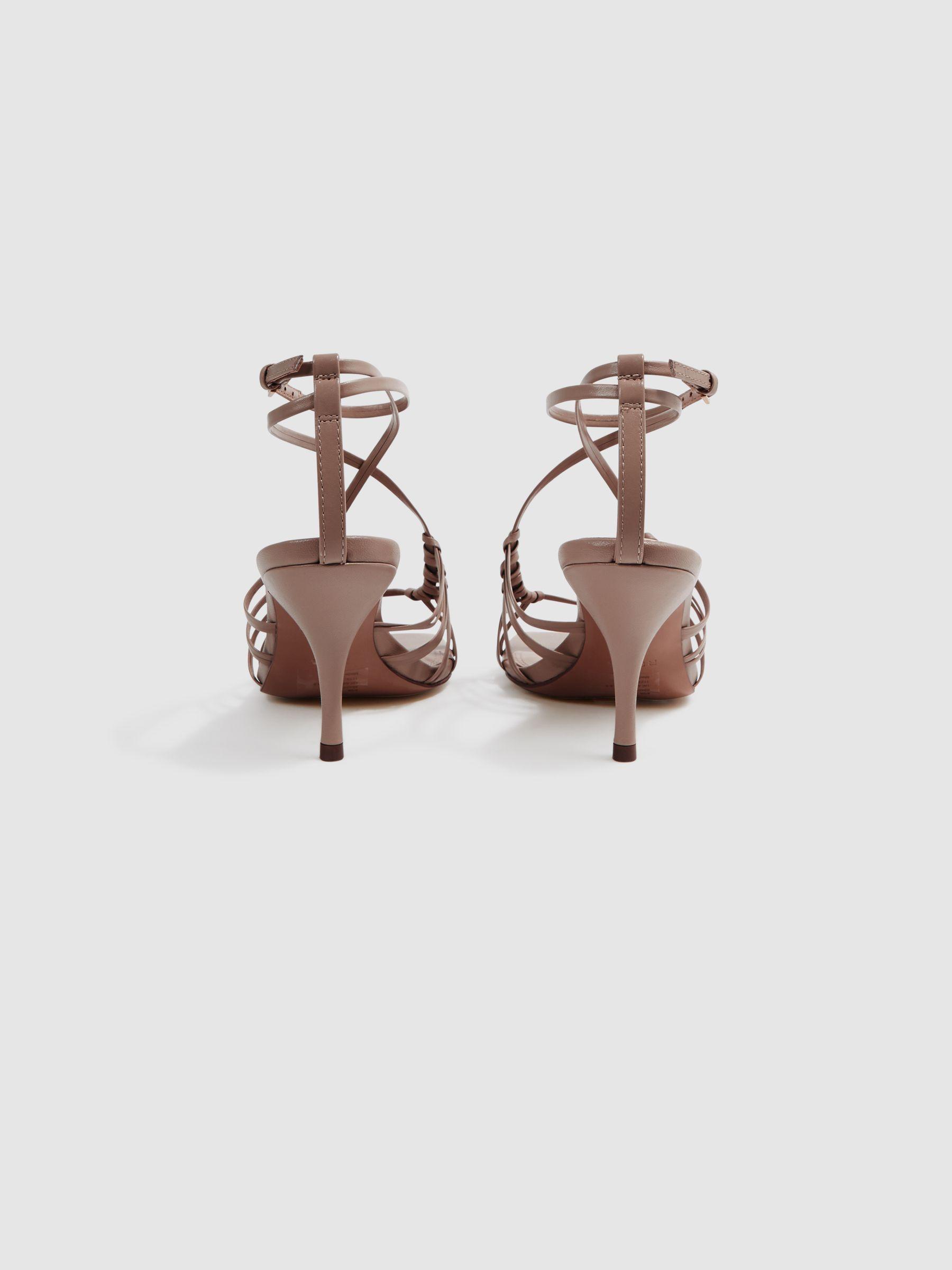 The Eva heels are a strappy design, crafted from leather to lend a luxe finishing touch to your occasionwear edits. The straps wrap around the ankle for a secure fit, then fasten with the adjustable buckle. 100% leather. Strappy design. Mid-height heel. Adjustable buckle fastening.