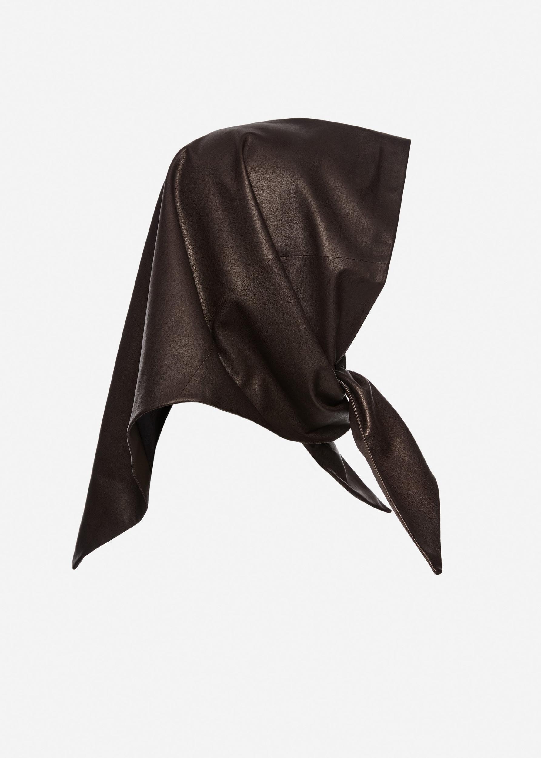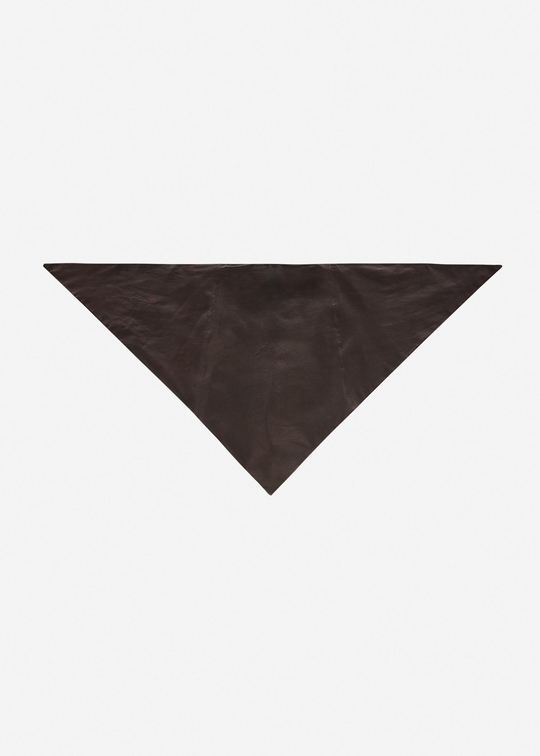 A triangle-shaped leather scarf designed to bring a modern edge to any outfit. The smooth, soft leather drapes effortlessly, and the elongated ends allow for a stylish tie under the chin. This scarf makes a statement while paying homage to timeless headwear traditions.