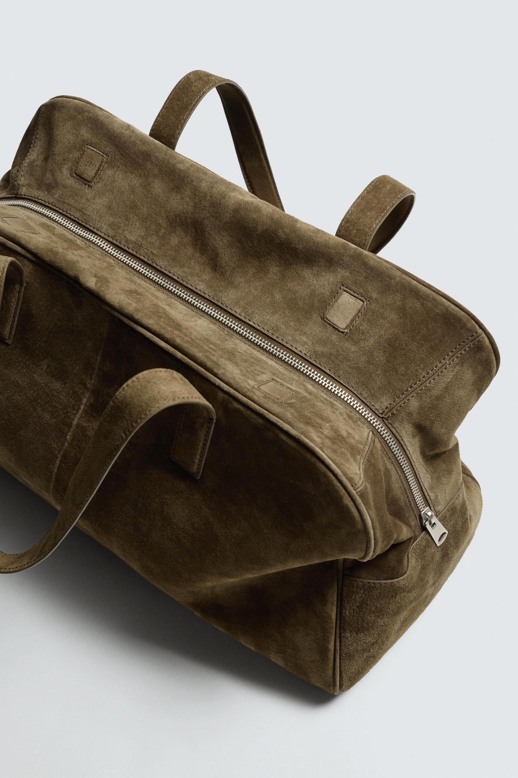 Leather travel bag with split suede finish. Main compartment with zipper and magnetic closure. Interior features a zipper pocket and a flat pocket. Two leather hand straps.