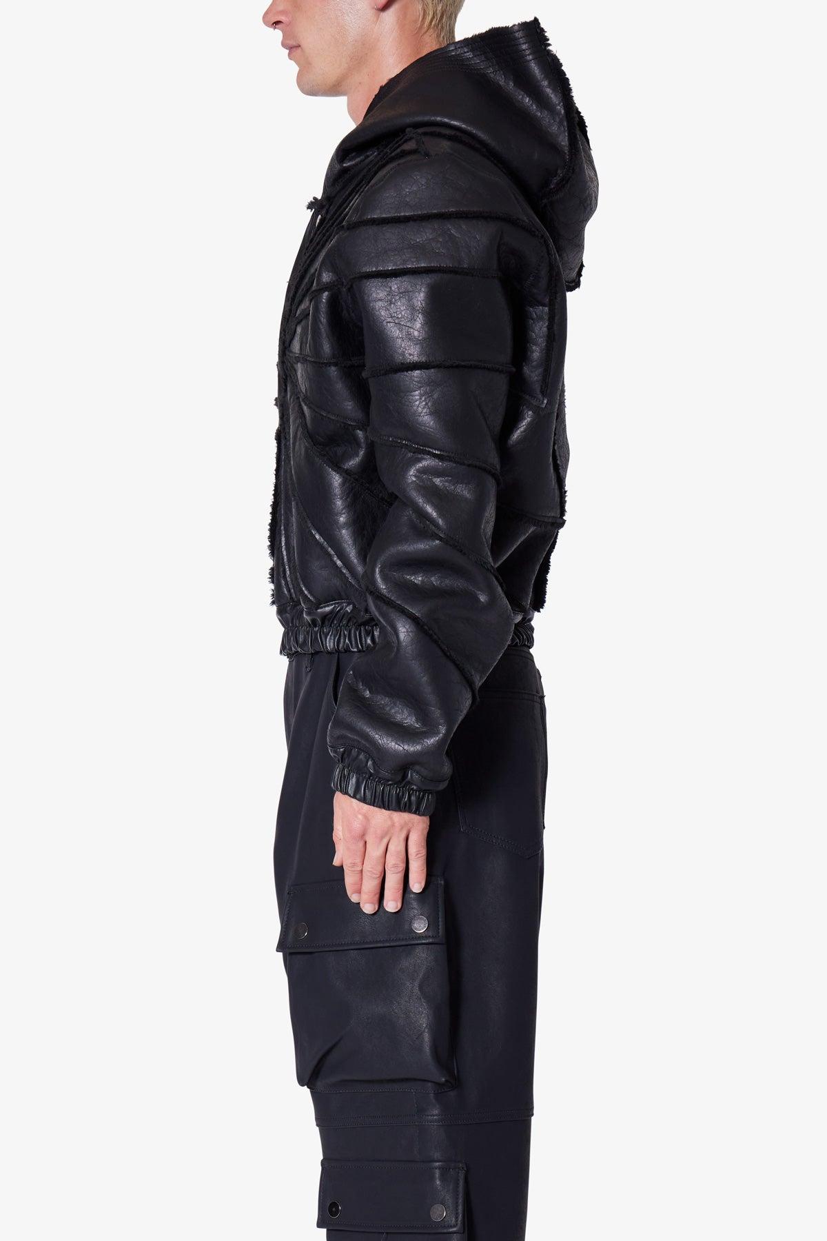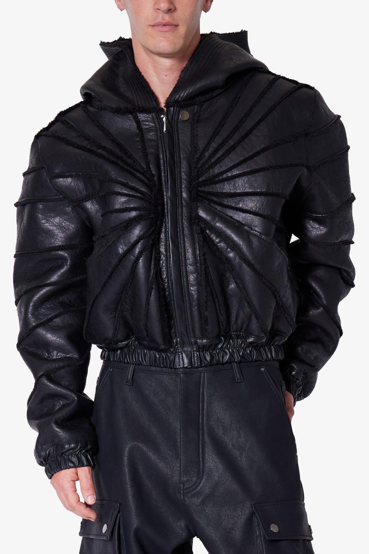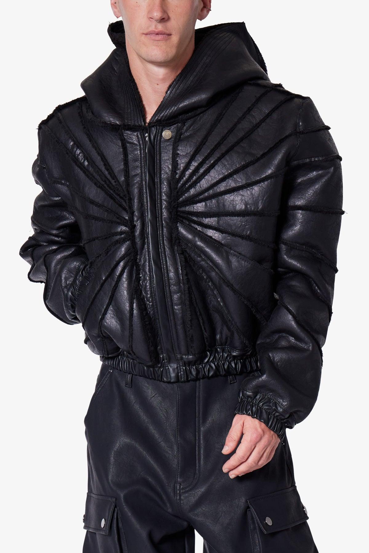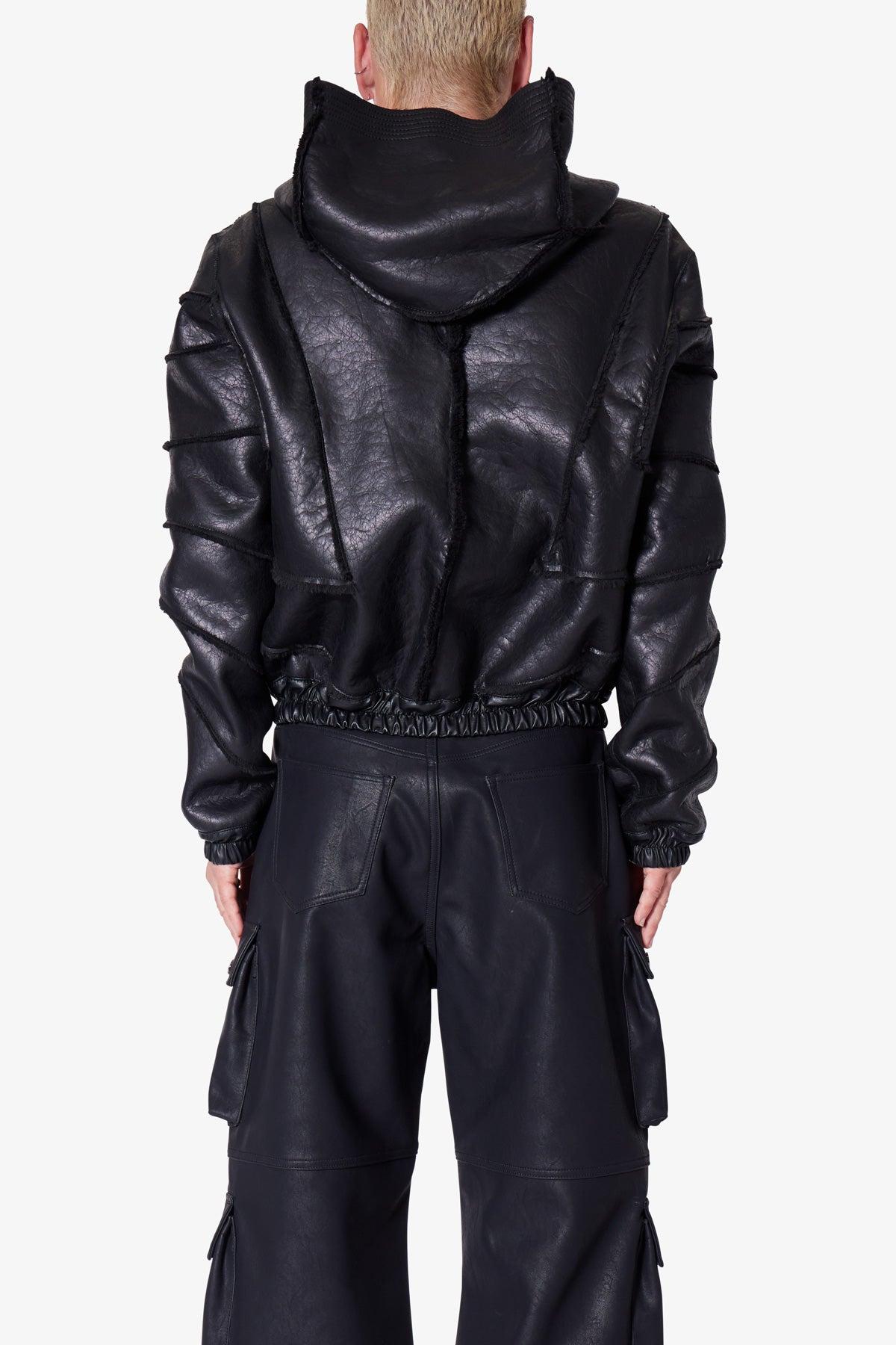 the Leather Web Cropped Hoodie is designed with a standard fit and features a zipper placket with snap at the collar, elasticized self closures at the wrist and waist, paneled in a spider web pattern with exposed seams, and is finished in a faux leather fabric that is faux fur lined. Details standard fit 100% polyester