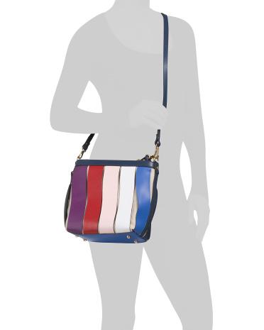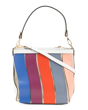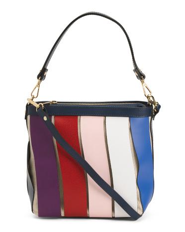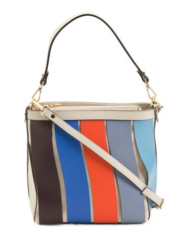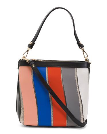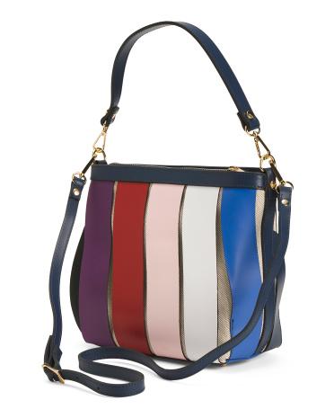 Detachable Top Carry Handle, Detachable Shoulder Strap, Color Block Design, Smooth Finish, Metal Feet, Gold Tone Hardware, Woven Accent, 11In W X 9.5In H, Zip Closure, 1 Interior Zip Pocket, 2 Interior Slip Pockets, Leather, Imported, Made In Italy | Leather Woven Color Block Panels Hobo for Women