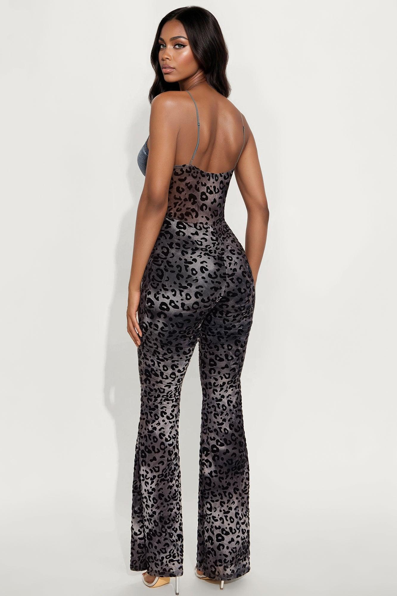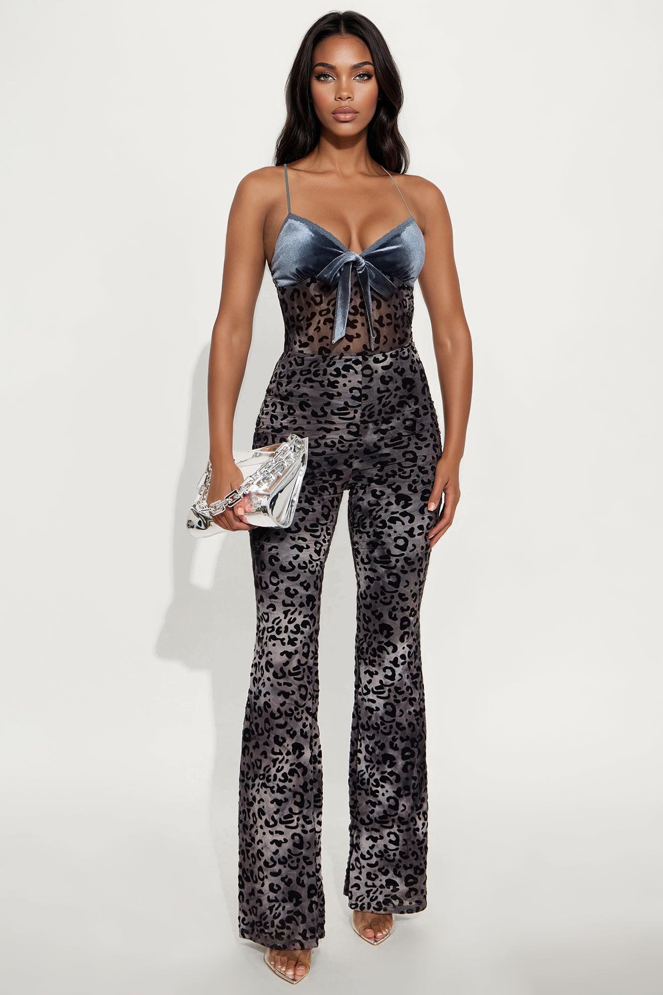 Available In Teal/combo. Jumpsuit Stretch Lined Adjustable Straps Front Tie Detail Invisible Side Zip Closure Flare Leg Inseam = 35" Disclaimer: Flocking Placement May Vary. Self: 95% Polyester 5% Spandex Contrast: 90% Polyester 10% Spandex Lining: 100% Polyester Imported