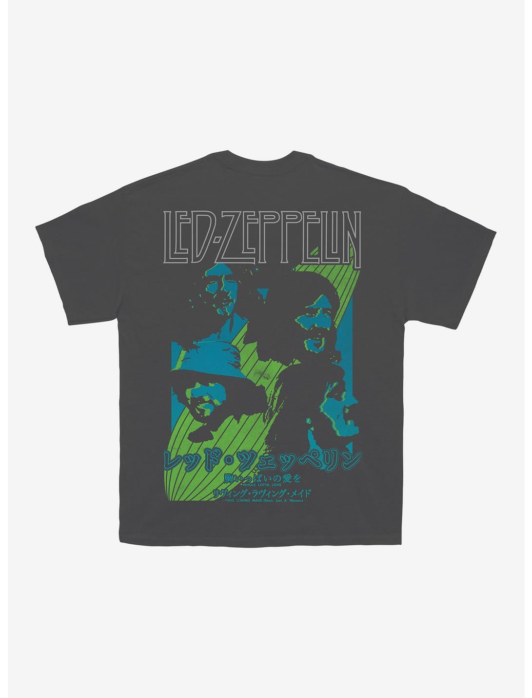 Led Zeppelin were huge in Japan, in their heyday. This two-sided dark grey tee shows the band's logo across the chest followed by their name in Japanese text and album-related copy on the front. The back shows a large graphic of the band members with the blimp in the background, with the same Japanese text below.100% cottonWash cold; dry lowImportedListed in men's/unisex sizes