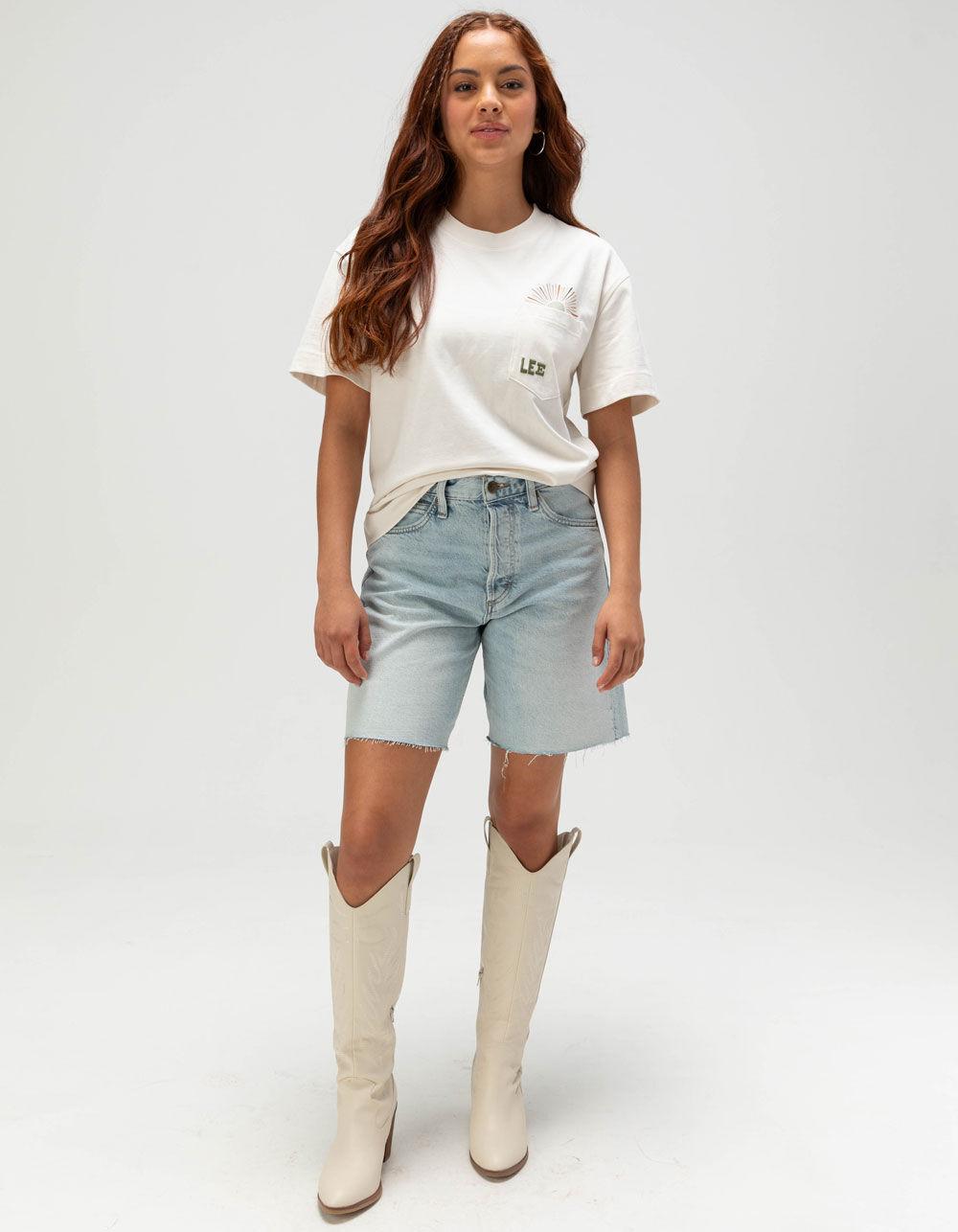 EGGSHELL. Lee Boxy Pocket Tee. Left chest pocket. Lee embroidery on pocket and graphic screened over pocket. Relaxed boxy fit. Crew neck. Short sleeve. 100% Cotton. Machine wash. Imported.