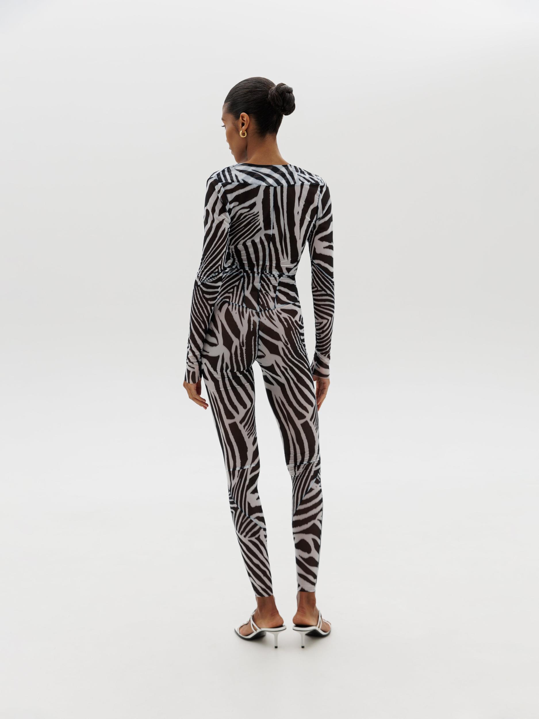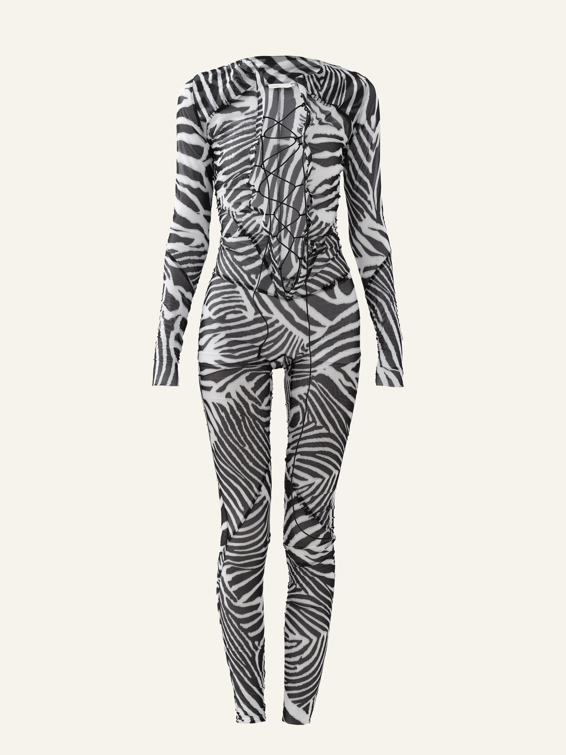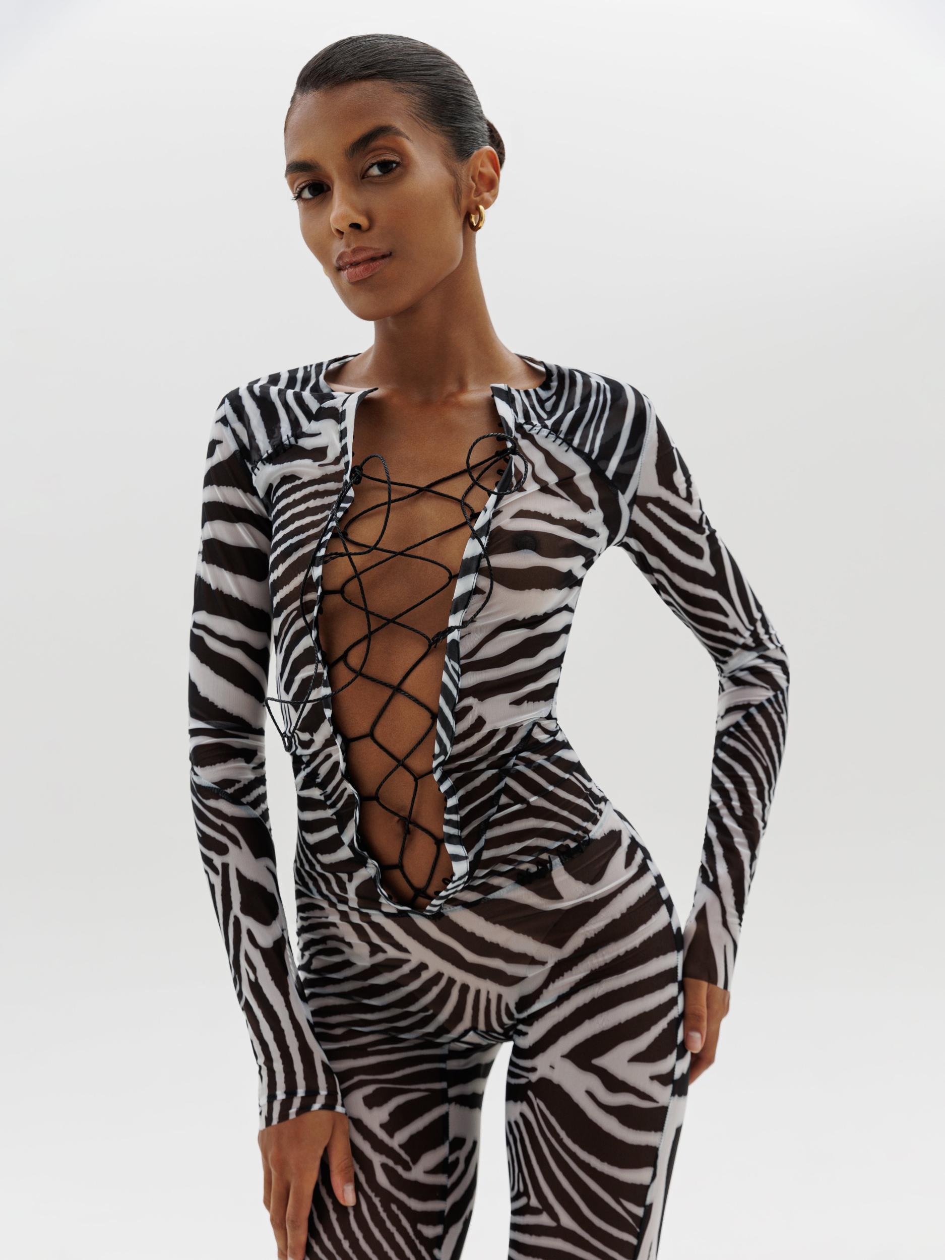 Sheer, untamed, and made to slip on like a secret. The mesh floats just above your skin, soft and weightless, while the zebra print brings a quiet kind of chaos. The front ties fall loose or cinch close—depending on what version of you shows up. It’s that kind of piece that doesn’t try too hard, but somehow ends up stealing the whole scene.