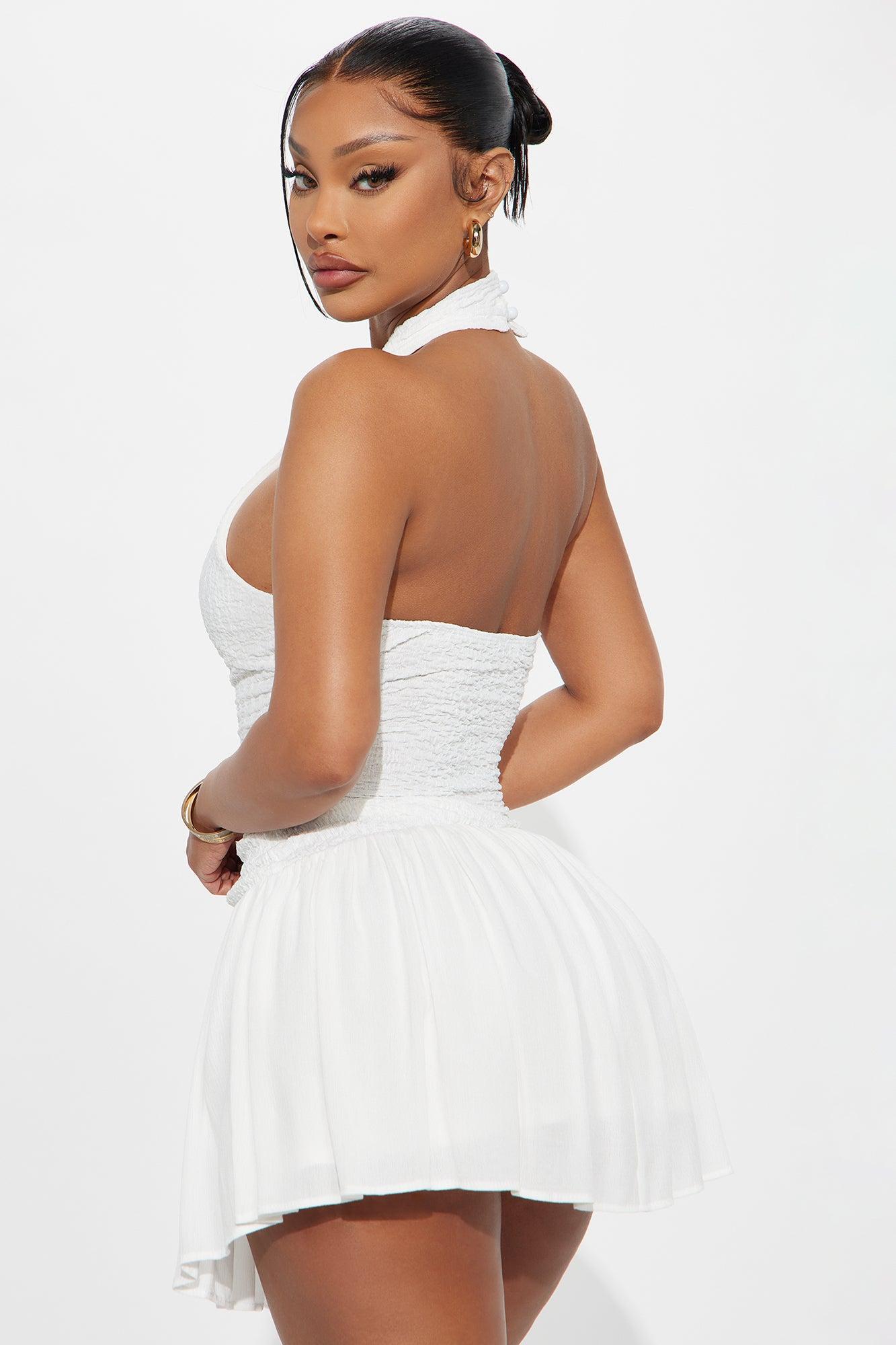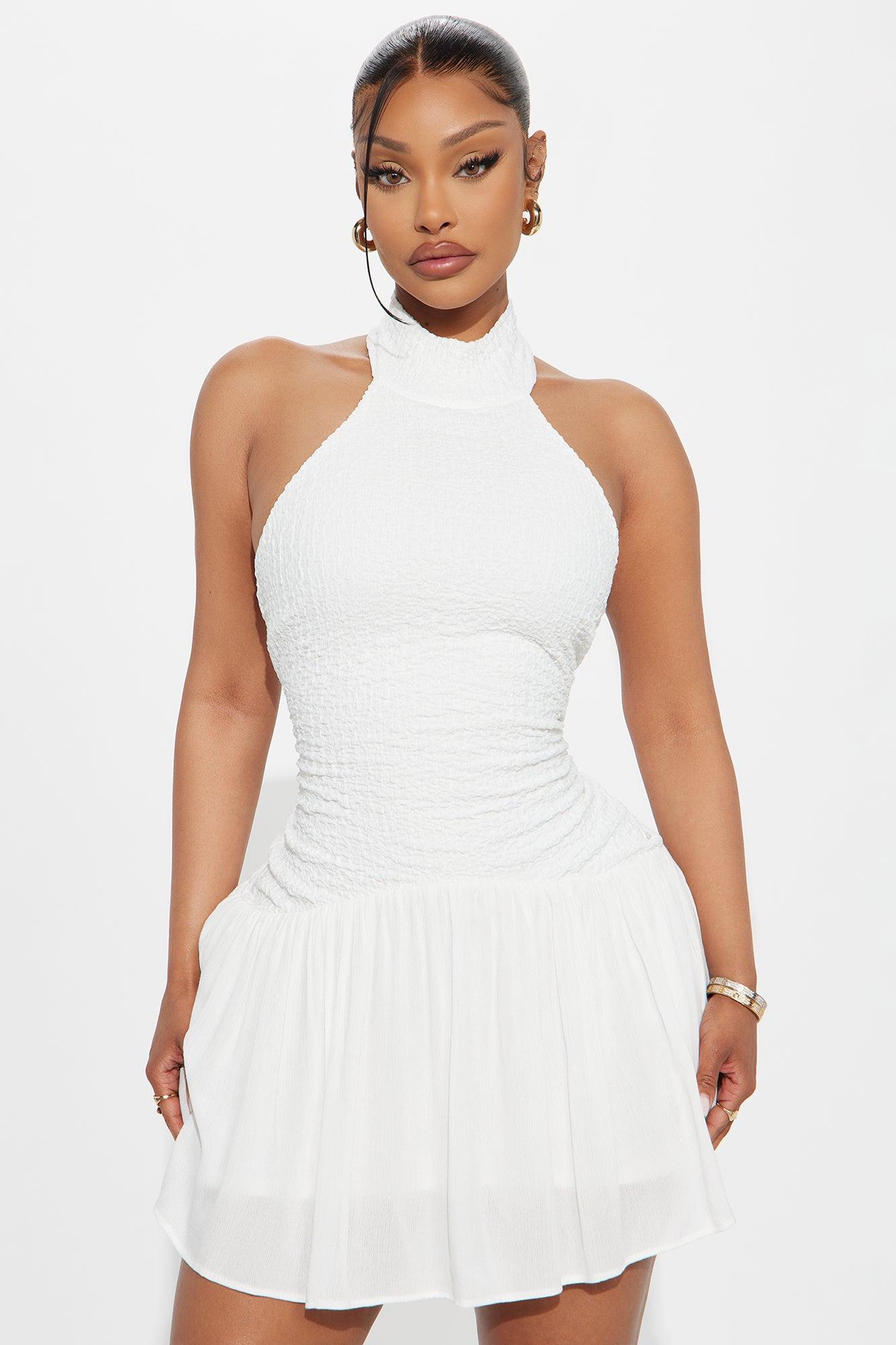 Available In Off White And Blue. Mini Dress Mock Neckline Halter Open Back Lined Stretch Length Measured Flat = 32" Self: 92% Polyester 8% Spandex Contrast: 100% Rayon Lining: 100% Polyester Imported California Proposition 65WARNING: Cancer and Reproductive Harm - www.P65Warnings.ca.gov.