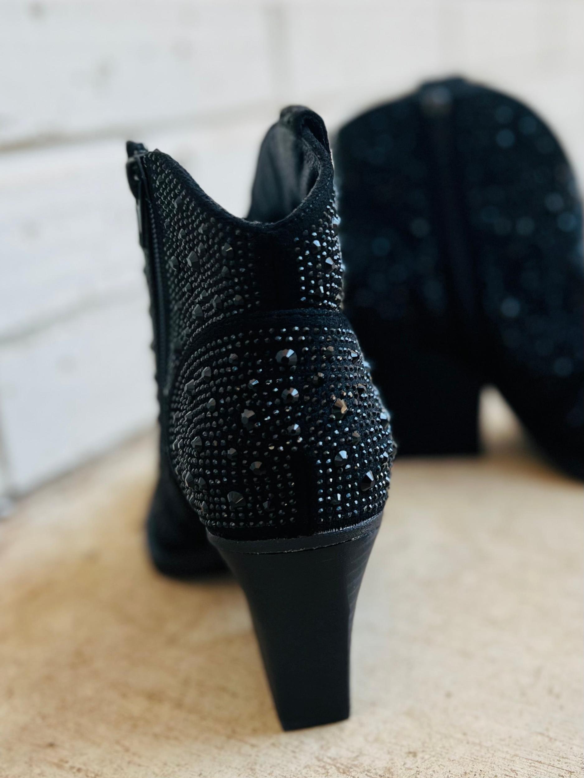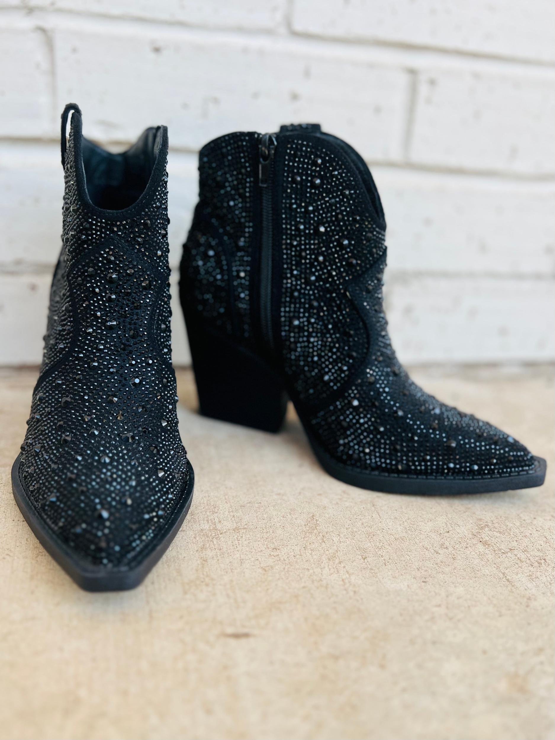 The Leg Up Black Booties are your shortcut to style! With a 3" heel, pointed toe and black rhinestone details, you'll strut in confidence and find your way through life with ease. Plus, the inside zipper means you won't find yourself endlessly searching for a way out. Look great, feel great! 8" in total height