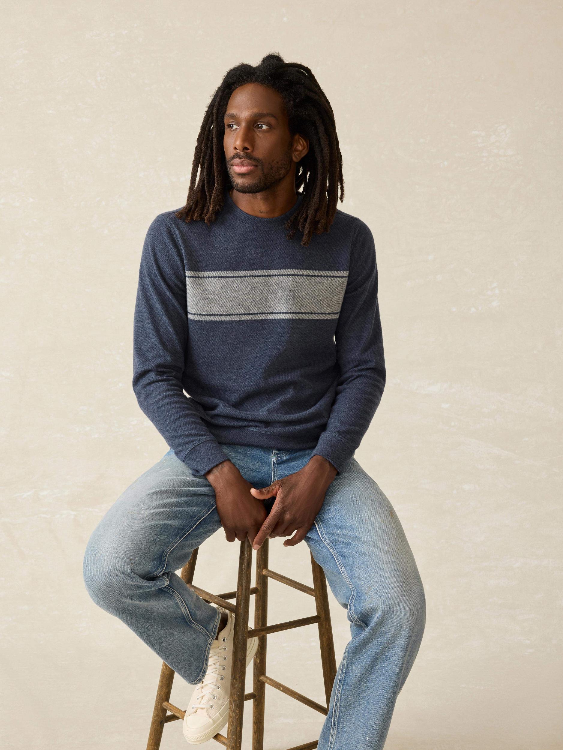 Designed for everyday versatility, this unbelievably soft crewneck is crafted with the same DNA as our world-famous Legend Sweater Shirt. It's cozy and relaxed – wear it on its own, over a t-shirt, or layer under a jacket or parka. Fit: Relaxed through the body with a straight fit and tapered sleeves Detail: Crewneck. Pullover style. Raglan sleeves with banded cuffs and hem. Engineered chest stripe. Material: 49% Organic Cotton, 33% REPREVE® Recycled Polyester, 16% Viscose, 2% Elastane Model: Rio is 6'2 wearing size Medium Care: Turn inside out. Machine wash cold with like colors. Gentle cycle. Do not bleach. Tumble dry low. Remove promptly. Cool iron when needed. MKH2406-NUR