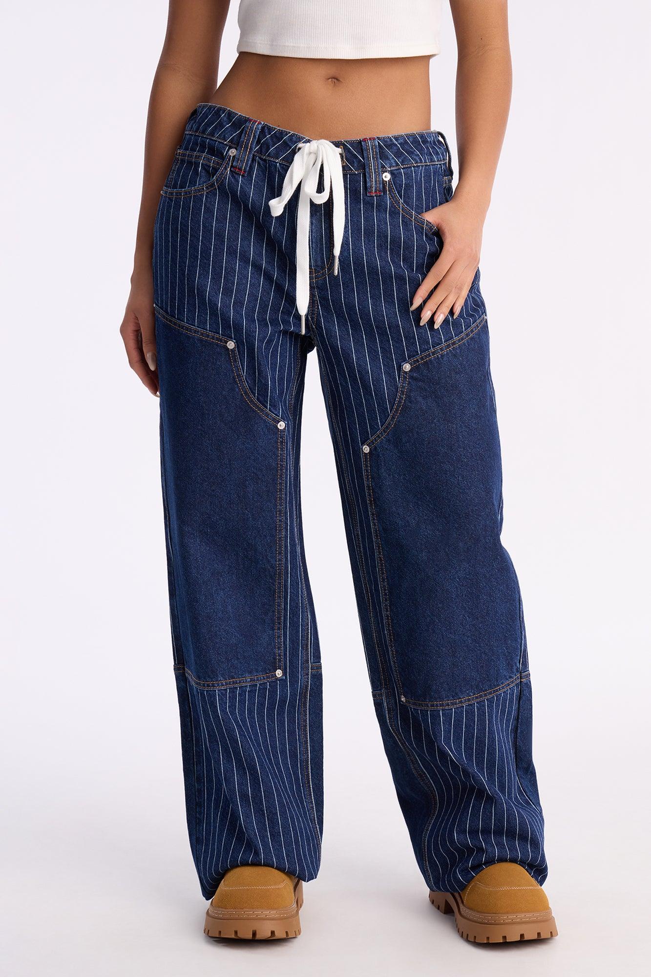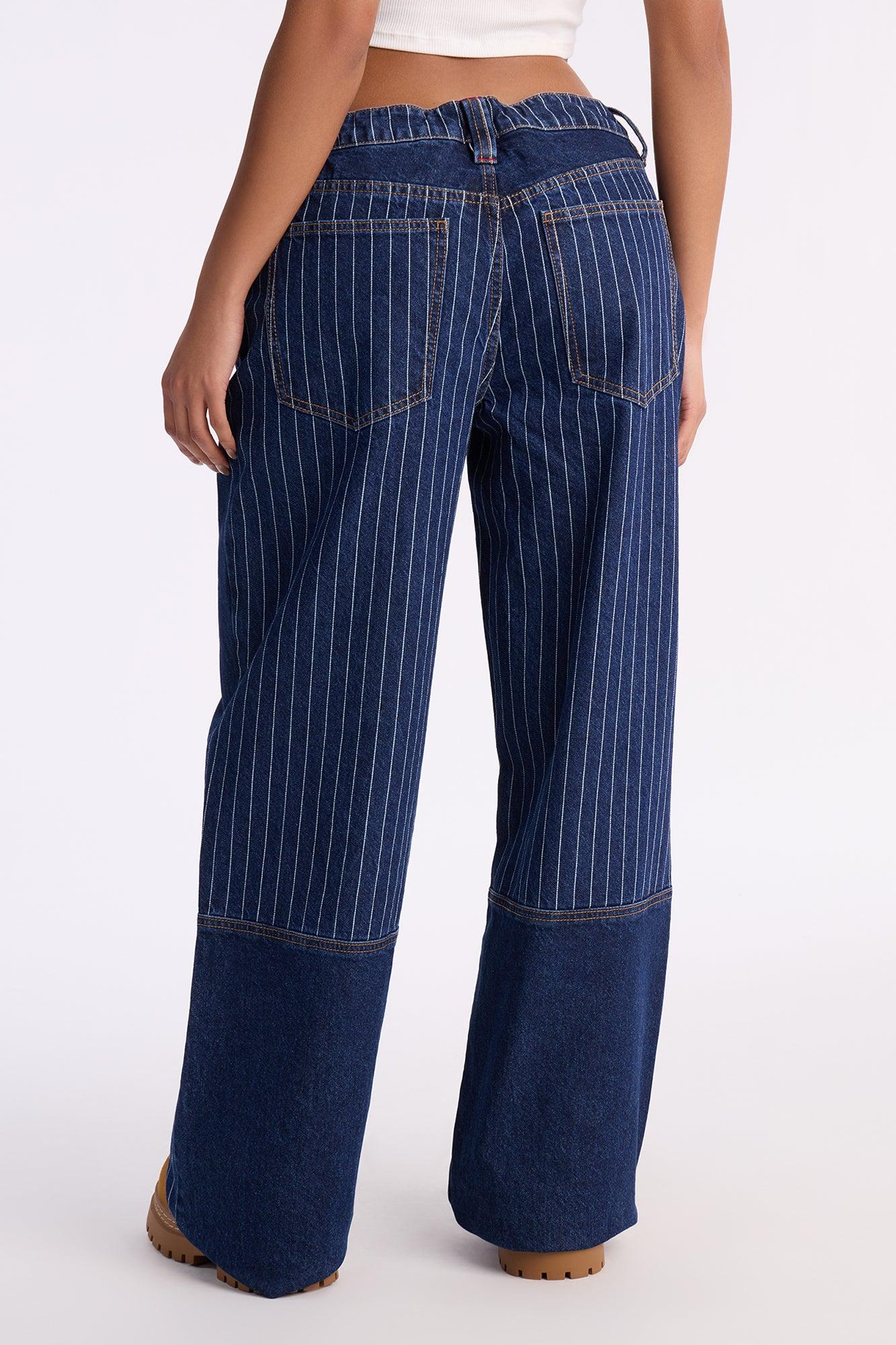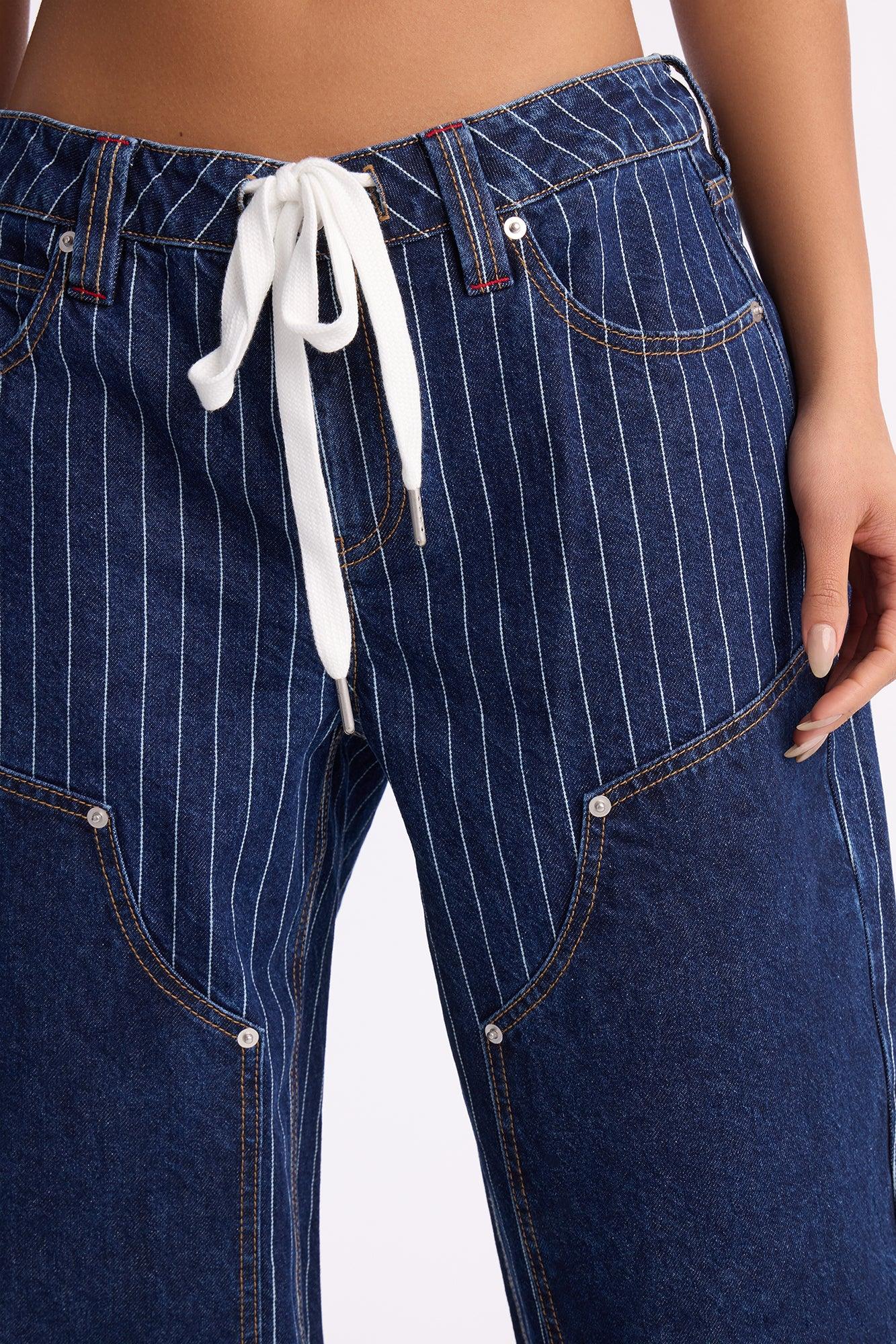 Available In Dark Wash. Pair With Legendary Striped Denim Jacket Wide Leg Jean 5 Pocket Tie Waist Striped Two Tone Utility Detail 10" Rise 33" Inseam Non-Stretch Disclaimer: Due To The Specialized Wash, Each Garment Is Unique. Self & Contrast: 100% Cotton Imported