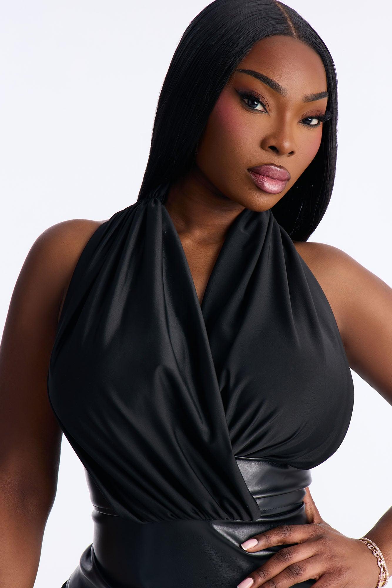 Available In Black. Faux Leather Top Halter V-Neck Sleeveless Ruched Cut Out Backless Back Zipper Closure Stretch Self: 55% Polyester 45% Polyurethane Contrast: 84% Polyester 16% Spandex Imported California Proposition 65WARNING: Cancer and Reproductive Harm - www.P65Warnings.ca.gov.